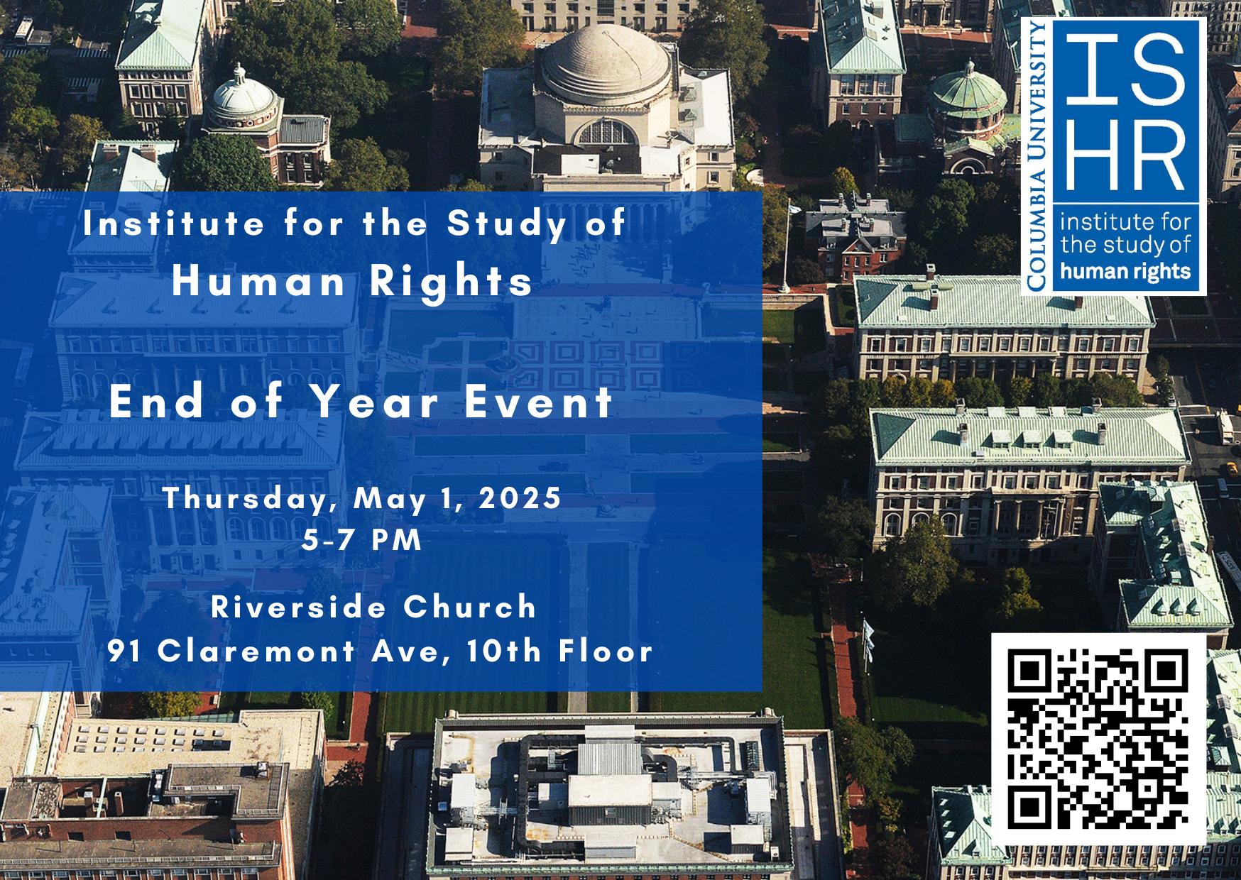 Join the Institute for the Study of Human Rights for our annual End of Year event, where we recognize the graduating cohort of human rights students. The department will gather to honor student accomplishments and socialize with ISHR students, faculty, staff, and some of the greater human rights community beyond campus.
