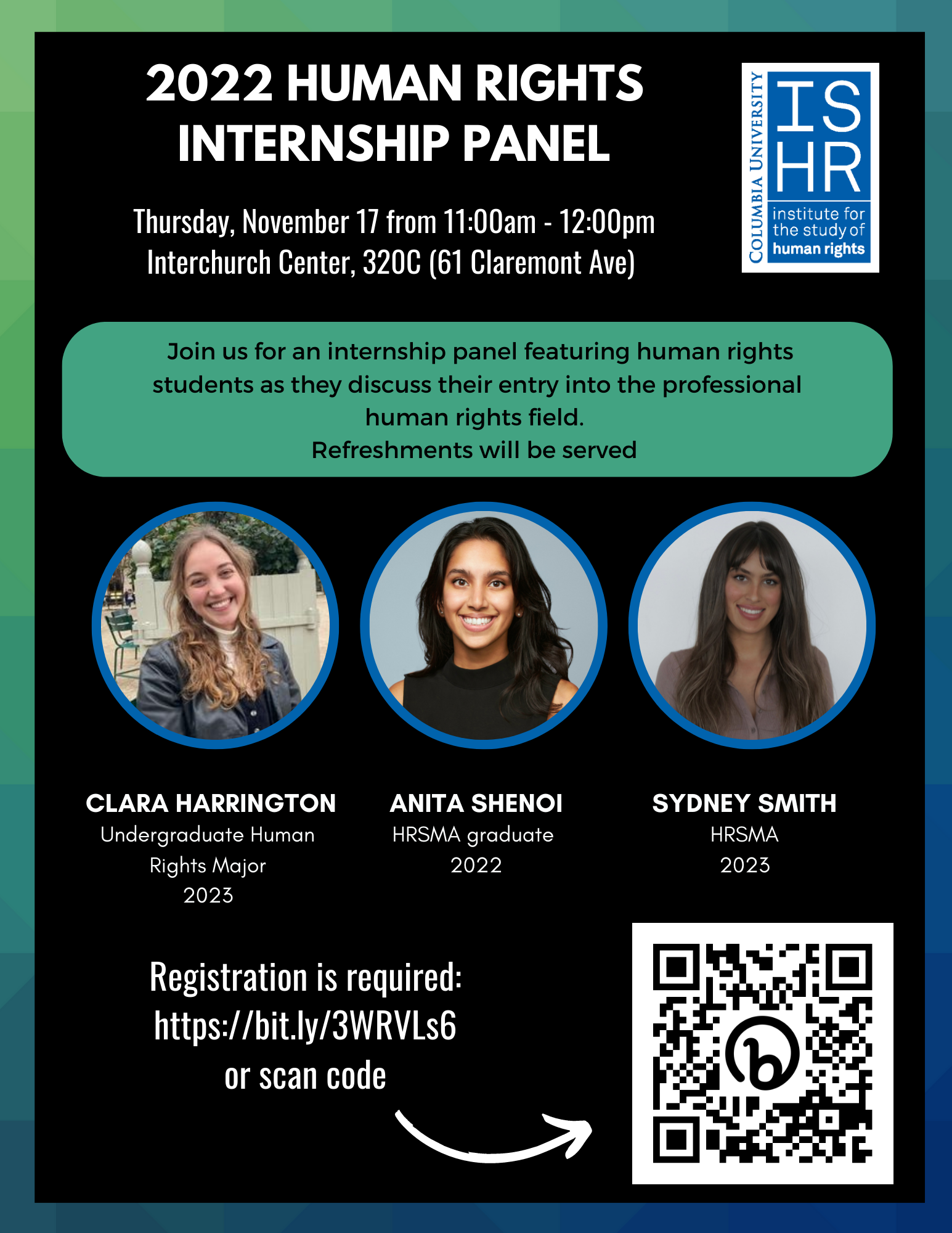 Thursday, November 17 from 11:00am - 12:00pmInterchurch Center, 320C (61 Claremont Ave) Join us for an internship panel featuring human rights students as they discuss their entry into the professional human rights field. Refreshments will be served. Panelists: Clara Harrington (Undergraduate Human Rights Major, 2023) Anita Shenoi (HRSMA graduate, 2022) Sydney Smith (HRSMA, 2023) Registration is required. Click below to registerEvent link