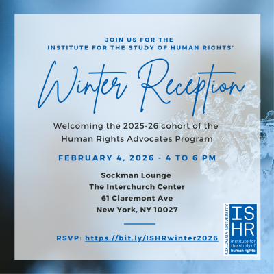 Wednesday, February 4, 2026 - 4pm to 6pmSockman Lounge (First Floor), The Interchurch Center, 61 Claremont Ave, New York, NY 10027The Institute for the Study of Human Rights will host a Winter Reception welcoming the 2025-26 cohort of the Human Rights Advocates Program. Join us to enjoy some light bites and drinks as we welcome seven advocates working on human rights issues around the globe. Please RSVP by Monday, February 2nd.. Click below to registerEvent link