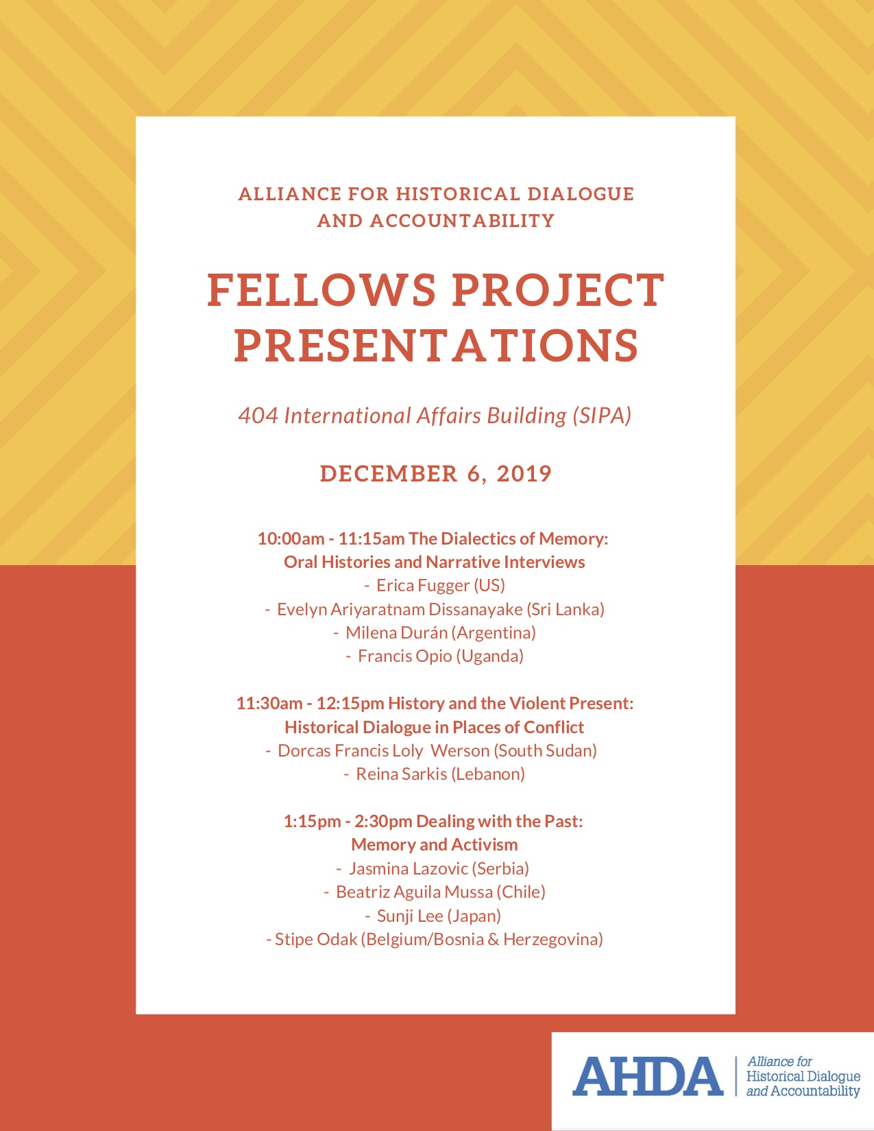 Join the Alliance for Historical Dialogue and Accountability (AHDA) program for the fellows project presentations. The fellows who will be presenting come from Argentina, Belgium/Bosnia & Herzegovina, Chile, Japan, Lebanon, Serbia, South Sudan, Sri Lanka, Uganda and the US. The fellows’ profiles are here: http://www.humanrightscolumbia.org/ahda/fellows