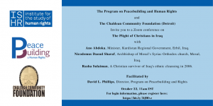 The Program on Peacebuilding and Human Rights and The Chaldean Community Foundation (Detroit) Invite you to a Zoom conference on "The Plight of Christians in Iraq" with: -Ano Abdoka, Minister, Kurdistan Regional Government, Erbil, Iraq.