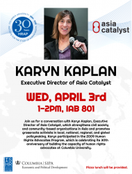 Join us for a conversation with Karyn Kaplan, Executive Director of Asia Catalyst, which strengthens civil society and community-based organizations in Asia and promotes grassroots activists in local, national, regional, and global policymaking, Karyn participated in the 2009 Human Rights Advocat