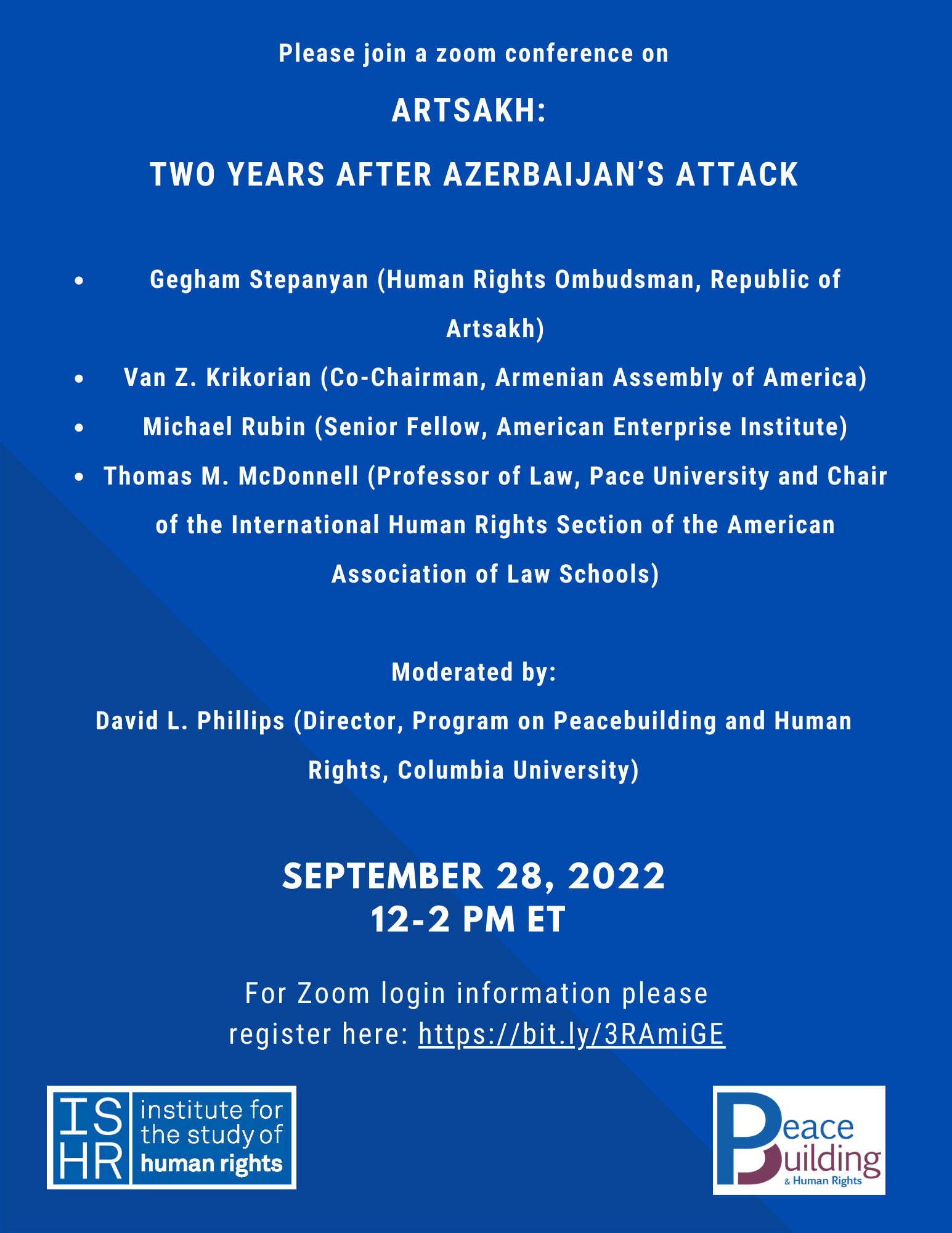 September 28, 2022 12 - 2 pm ETPlease join a Zoom conference on "Artsakh: Two Years After Azerbaijan's Attack" Gegham Stepanyan (Human Rights Ombudsman, Republic of Artsakh) Van Z. Krikorian (Co-Chairman, Armenian Assembly of America) Michael Rubin (Senior Fellow, American Enterprise Institute) Thomas M. McDonnell (Professor of Law, Pace University and Chair of the International Human Rights Section of the American Association of Law Schools) Moderated by: David L. Phillips (Director, Program on Peacebuilding and Human Rights, Columbia University) Click below to register for the webinarEvent link