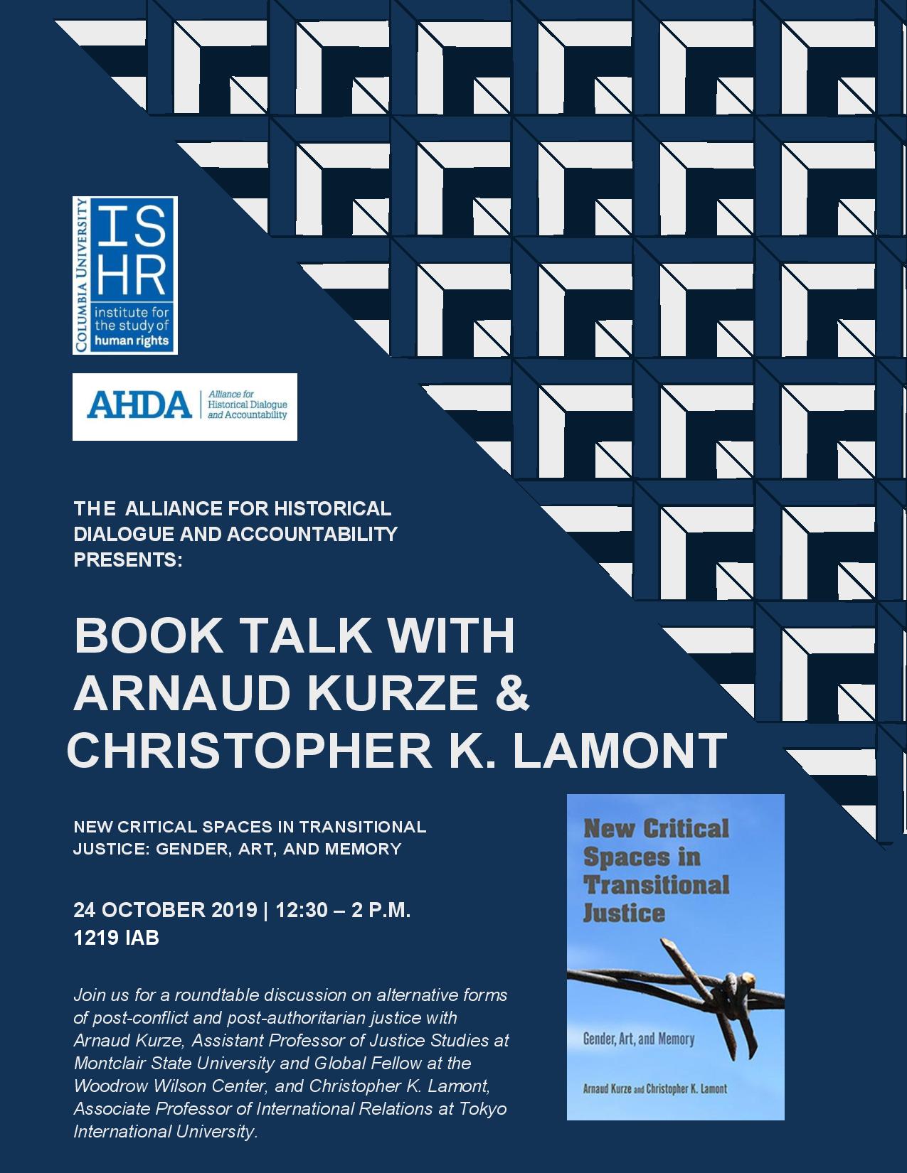 Thursday, October 24, 2019 12:30 PM - 2:00 PMInternational Affairs Building, 420 W. 118 St., New York, NY 10027 Marshall D. Shulman Seminar Room, 1219The Alliance for Historical Dialogue and Accountability (AHDA) Program is hosting Arnaud Kurze and Christoper K. Lamont for a book talk on "New Critical Spaces of Transitional Justice: Gender, Art and Memory". Since the 1980s, transitional justice mechanisms have been increasingly applied to account for mass atrocities and grave human rights violations throughout the world. Over time, post-conflict justice practices have expanded across continents and state borders and have fueled the creation of new ideas that go beyond traditional notions of amnesty, retribution, and reconciliation. Gathering work from contributors in international law, political science, sociology, and history, New Critical Spaces in Transitional Justice addresses issues of space and time in transitional justice studies. It explains new trends in responses to post-conflict and post-authoritarian nations and offers original empirical research to help define the field for the future. Moderator: Ariella Lang, PhD, Associate Dean of Academic Affairs, Director of Undergraduate Research and Fellowships Click below to see the event on the Columbia events calendar.Event link