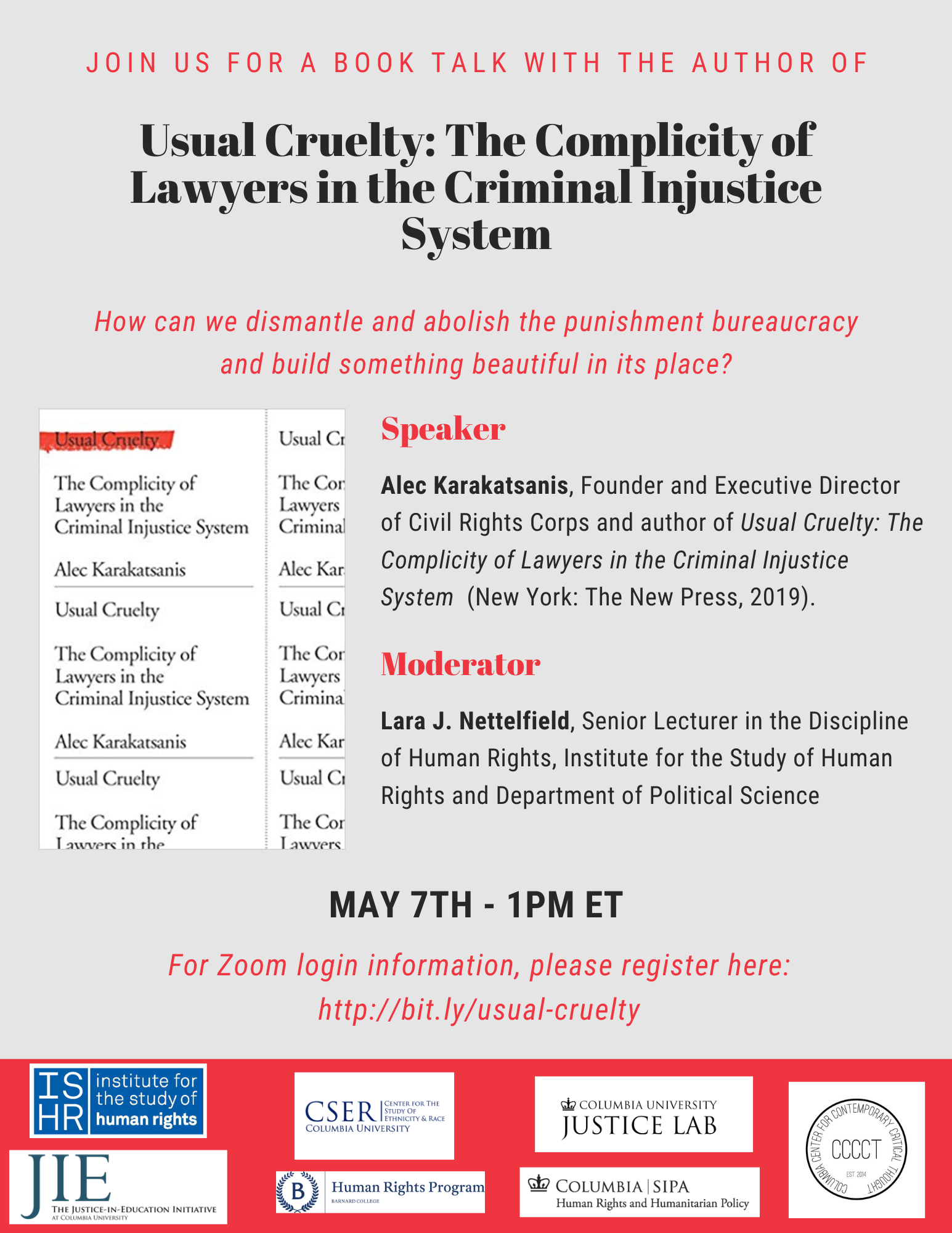 Friday, May 7, 2021 1:00 PM - 2:00 PMOnlineJoin us for a book talk with the author of "Usual Cruelty: The Complicity of Lawyers in the Criminal Injustice System" How can we dismantle and abolish the punishment bureaucracy and build something beautiful in its place? Speaker: Alec Karakatsanis, Founder and Executive Director of Civil Rights Corps and author of Usual Cruelty: The Complicity of Lawyers in the Criminal Injustice System (New York: The New Press, 2019). Moderator: Lara J. Nettelfield, Senior Lecturer in the Discipline of Human Rights, Institute for the Study of Human Rights and Department of Political Science For Zoom login information, please register here: http://bit.ly/usual-cruelty Click below to see the event on the Columbia events calendar.Event link