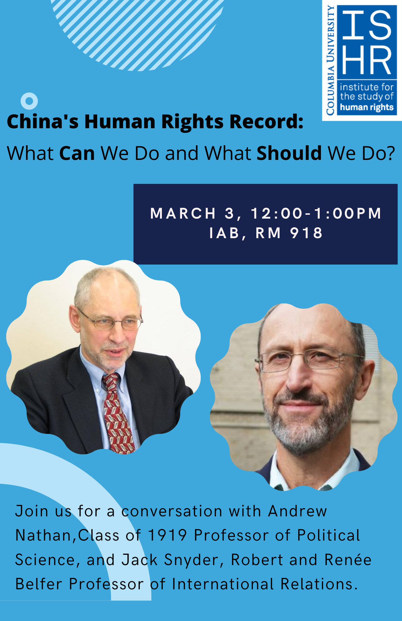 Thursday, March 3, 2022 12:00 PM - 1:00 PMThe Institute for the Study of Human Rights is hosting a new event: China's Human Rights Record: What Can We Do and What Should We Do? This conversation will be led by Jack Snyder, Robert and Renée Belfer Professor of International Relations, and Andrew Nathan, Class of 1919 Professor of Political Science. The two will discuss what Americans and other foreign citizens can do about human rights violations that are occurring in China, and whether these are things that non-Chinese citizens should do. What are our moral obligations, and what actions might be effective in influencing the human rights situation in China? The event will be held on Thursday, March 3 from 12:00 - 1:00pm at the International Affairs Building, room 918. Click below to see the event on the Columbia events calendar.Event link