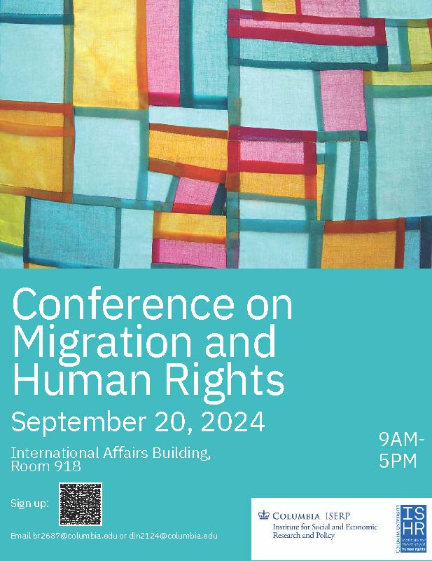 Friday, September 20, 2024, 9:00 a.m. - 5:00 p.m.International Affairs Building, Room 707Migrants are one of the most vulnerable populations of the world, especially migrants from poorer countries that are unable or unwilling to protect them abroad. The study of refugee and migration rights provides a lens through which we can examine the profound and intricate challenge that our world faces. More often than not, though, in discussions on migration, policymakers fail to center the migrant herself and her rights. To advance our understanding of migration and human rights, we invite students and faculty in all social science disciplines to attend our conference, sponsored by the Institute for Social and Economic Research and Policy (ISERP). Graduate students will present on these ever-relevant issues. Please apply by May 31, 2024. Preseenter Registration To present, please fill out the following form: https://forms.gle/32MBMokB3rwvPNTbA Conference Format The conference will take place in person at Columbia University on Friday, September 20, 2024. Presentations will be followed by comments from discussants. Contacts Please email Beenish Riaz (br2687@columbia.edu) or Dany Luz Carmona Niangar (dln2124@columbia.edu) if you have any questions. Click below to register as a presenterEvent link