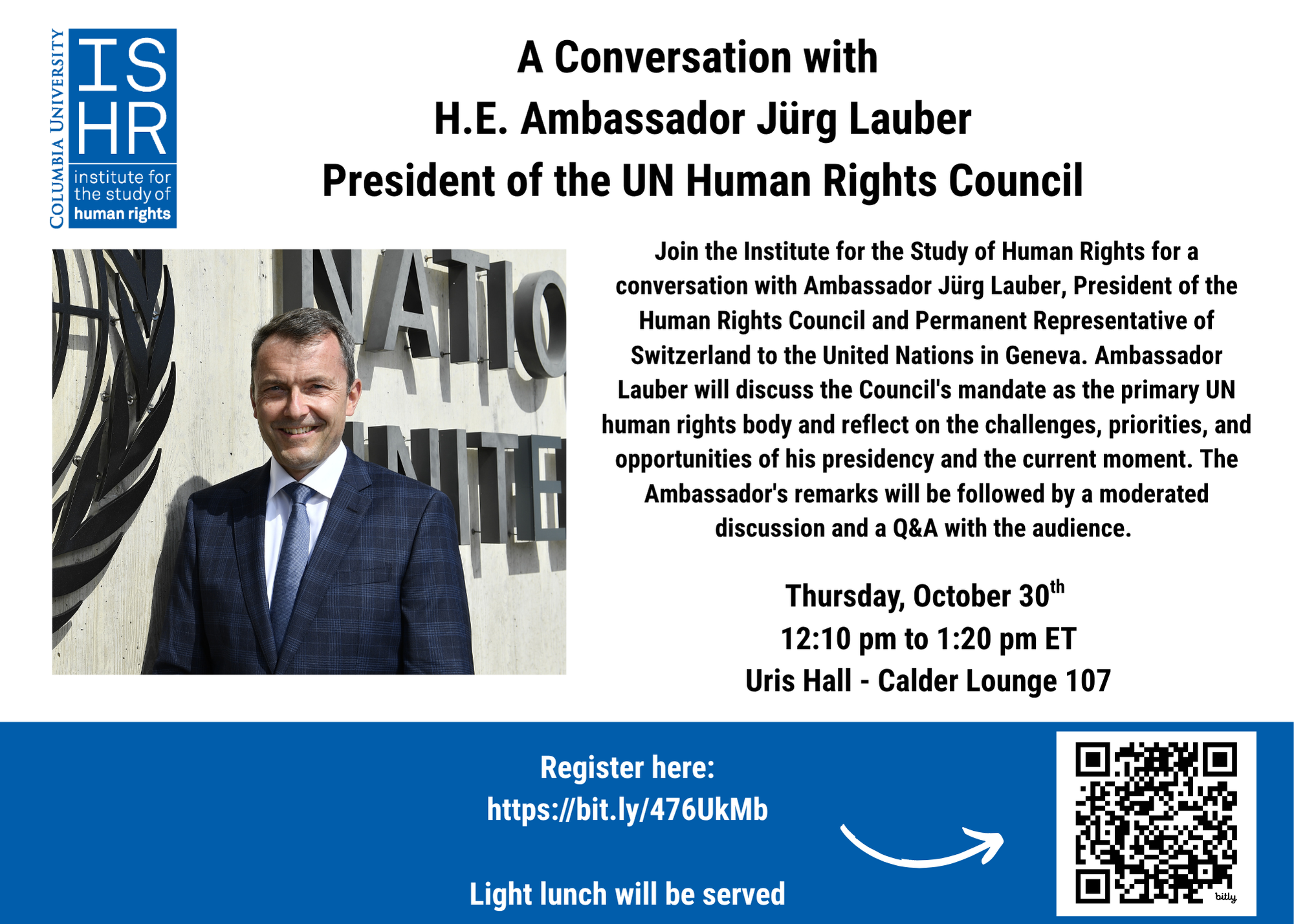 Thursday, October 30, 2025 12:10 PM - 1:20 PMUris Hall, 3022 Broadway, New York, NY 10027 Room/Area: 107Join us for a conversation with Ambassador Jürg Lauber, President of the Human Rights Council and Permanent Representative of Switzerland to the United Nations in Geneva. Ambassador Lauber will discuss the Council's mandate as the primary UN human rights body and reflect on the challenges, priorities, and opportunities of his presidency and the current moment. The Ambassador's remarks will be followed by a moderated discussion and a Q&A with the audience. Light lunch will be served. Click below to registerEvent link