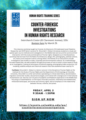 This intensive workshop taught by Forensic Architecture's (FA) dedicated Israel-Palestine Researcher and ISHR Senior Lecturer Dr. Shourideh C. Molavi introduces students to visual and spatial open-source methods and investigations in the Middle East and around the world and their intersection with the study and discipline of human rights. Designed as an interdisciplinary workshop that borrows from the fields of architecture, design, film, photography, political science, art, history and computer science, among others, the themes of our discussions include investigative case studies on state, corporate and environmental violence. As a methodology-focused masterclass, we walk students through the process of how to build a visual research study as an investigation, looking at techniques of political mapping, photography/video production, 3D modeling, satellite analysis and historical research that have elsewhere been used by FA.