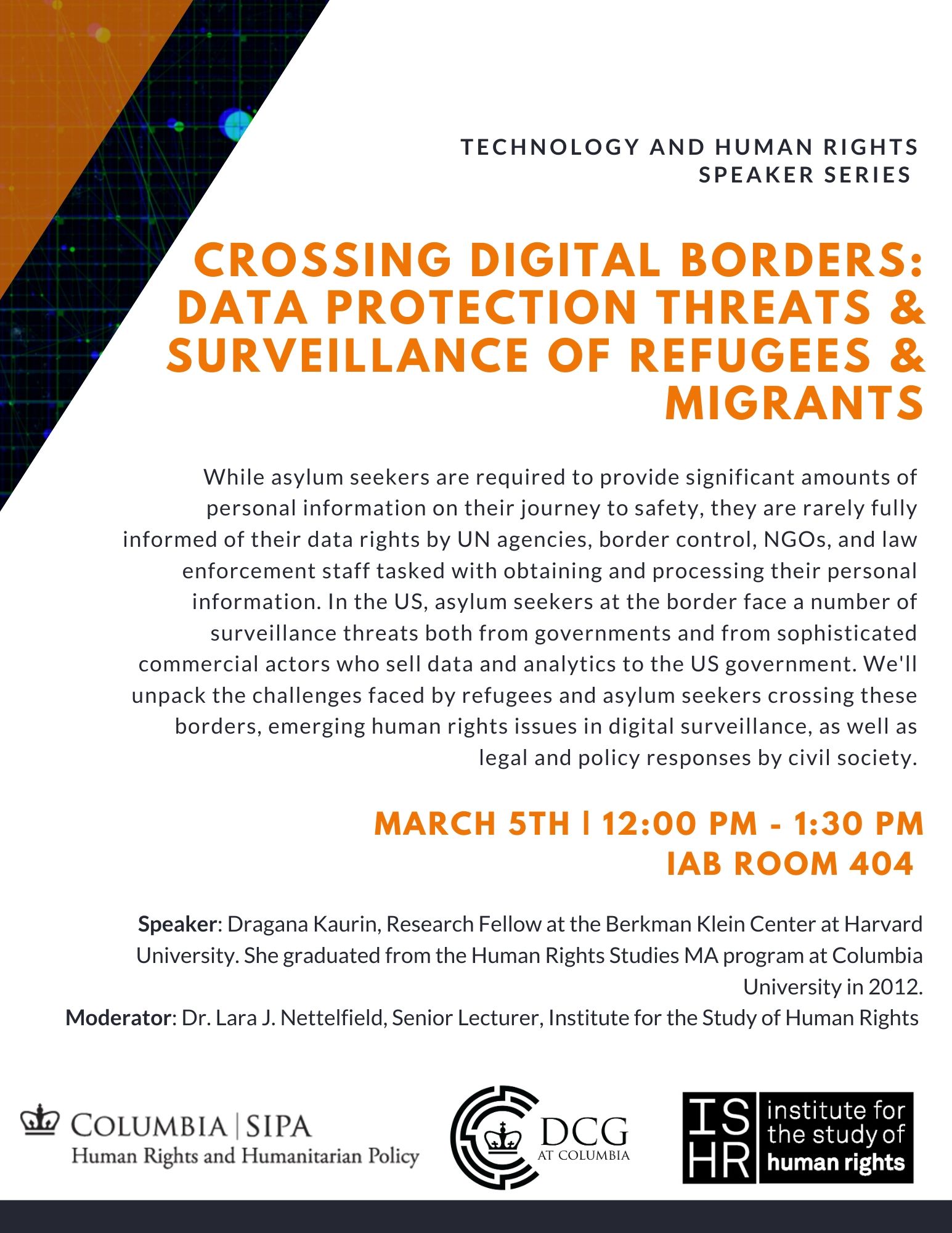 Thursday, March 5, 2020 12:00 PM - 1:30 PMInternational Affairs Building, 420 W. 118 St., New York, NY 10027 Room 404While asylum seekers are required to provide significant amounts of personal information on their journey to safety, they are rarely fully informed of their data rights by UN agencies, border control, NGOs, and law enforcement staff tasked with obtaining and processing their personal information. In the US, asylum seekers at the border face a number of surveillance threats both from governments and from sophisticated commercial actors who sell data and analytics to the US government. We'll unpack the challenges faced by refugees and asylum seekers crossing these borders, emerging human rights issues in digital surveillance, as well as legal and policy responses by civil society. Speaker: Dragana Kaurin, Research Fellow at the Berkman Klein Center at Harvard University. She graduated from the Human Rights Studies MA program at Columbia University in 2012. Moderator: Dr. Lara J. Nettelfield, Senior Lecturer, Institute for the Study of Human Rights Click below to see the event on the Columbia events calendar.Event link