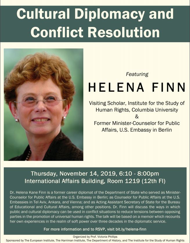 Dr. Helena Kane Finn is a former career diplomat of the Department of State who served as Minister-Counselor for Public Affairs at the U.S. Embassy in Berlin; as Counselor for Public Affairs at the U.S. Embassies in Tel Aviv, Ankara, and Vienna; and as Acting Assistant Secretary of State for the Bureau of Educational and Cultural Affairs, among other positions. Dr. Finn will discuss the ways in which public and cultural diplomacy can be used in conflict situations to reduce tensions between opposing parties in the promotion of universal human rights. The talk will be based on a memoir which recounts her own experiences in the realm of soft power over three decades in the diplomatic service.