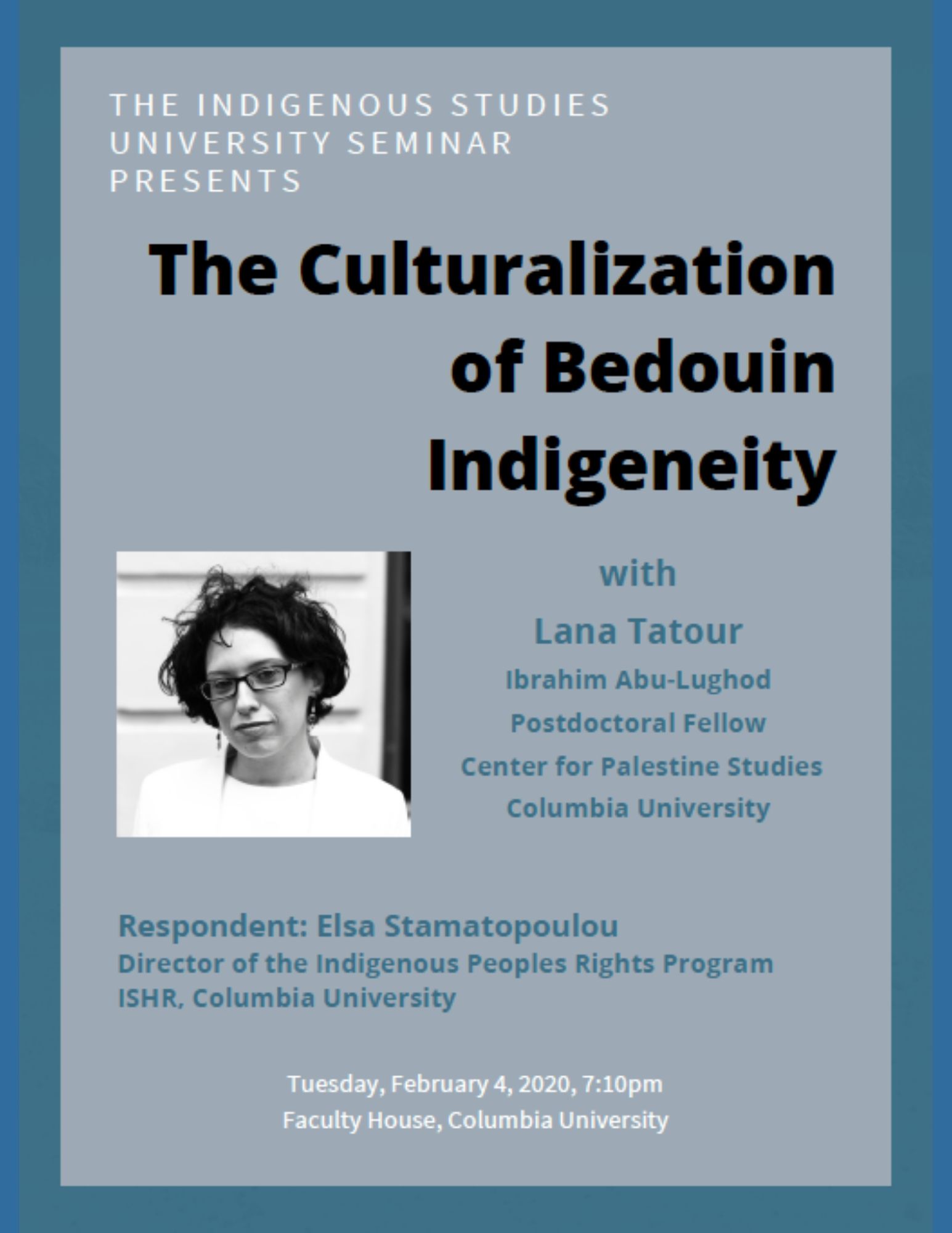 Tuesday, February 4, 2020 7:10 PM - 8:30 PMFaculty House, 64 Morningside Dr., New York, NY 10027 The Bedouin in the Naqab/Negev, the southern region of Israel/Palestine, currently enjoy international recognition of their status as indigenous – an achievement unique among Palestinians. This recognition has been advanced by sympathetic critical scholars and civil society organizations. In this paper, Lana Tatour argues that justification for the recognition of the Bedouin as indigenous has been predicated on the mobilization of an essentialist model of indigeneity that centers culture as the defining feature of indigeneity and is premised on the fetishization of the Bedouin as the embodiment of a premodern and endangered culture that is deserving of protection and preservation. The framing of Bedouin indigeneity as a cultural legal category cannot be understood outside of a larger process that Tatour conceptualizes as the culturalization of indigeneity. Through the Bedouin case, she traces the entwinement of the international indigenous rights regime with racial and colonial productions of liberal multiculturalism. Click below to see the event on the Columbia events calendar.Event link