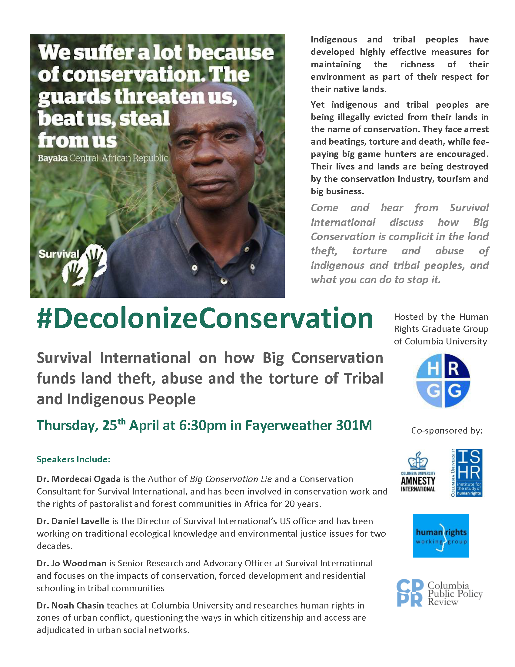 Come and hear from Survival International discuss how Big Conservation is complicit in the land theft, torture and abuse of indigenous and tribal peoples, and what you can do to stop it.