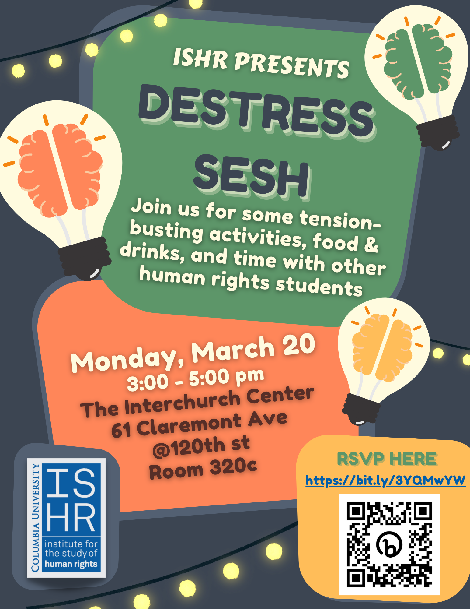 Monday, March 20th 3-5 pmInterchurch 320c - 61 Claremont Ave @120th StreetIt’s back by popular demand! Join us for some tension-busting activities, food and drinks, and time with other human rights students. Click below to registerEvent link