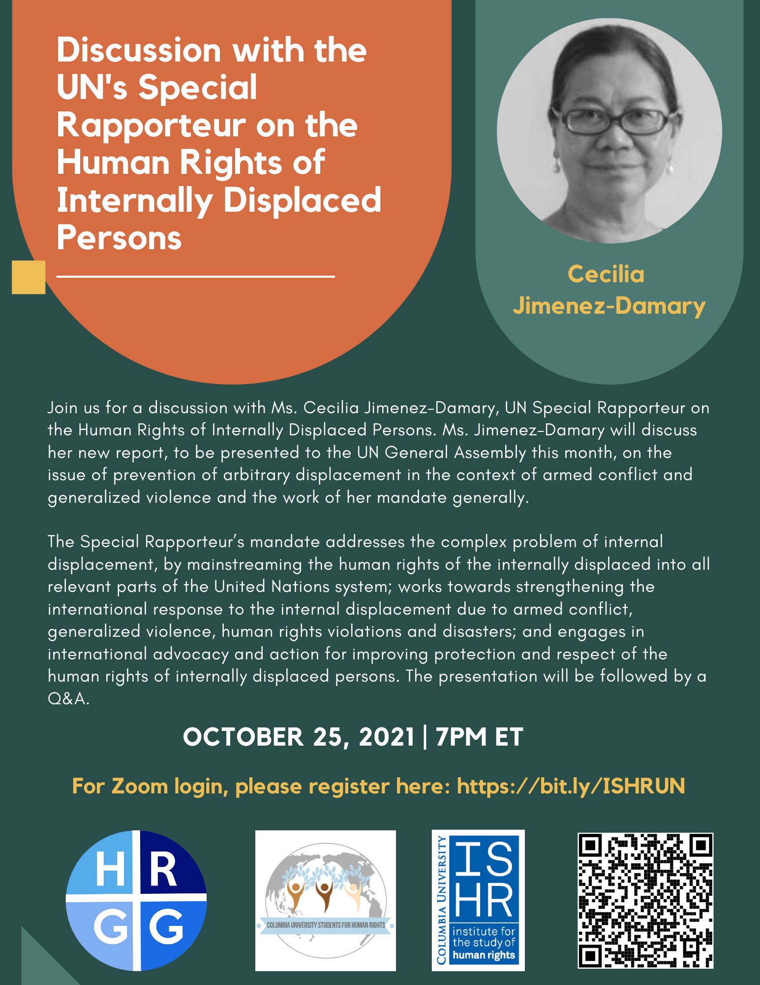 October 25, 2021 at 7pm ETOnline EventRegistration Link: https://bit.ly/ISHRUN Join us for a discussion with Ms. Cecilia Jimenez-Damary, UN Special Rapporteur on the Human Rights of Internally Displaced Persons. Ms. Jimenez-Damary will discuss her new report, to be presented to the UN General Assembly this month, on the issue of prevention of arbitrary displacement in the context of armed conflict and generalized violence and the work of her mandate generally. The Special Rapporteur’s mandate addresses the complex problem of internal displacement, by mainstreaming the human rights of the internally displaced into all relevant parts of the United Nations system; works towards strengthening the international response to the internal displacement due to armed conflict, generalized violence, human rights violations and disasters; and engages in international advocacy and action for improving protection and respect of the human rights of internally displaced persons. The presentation will be followed by a Q&A. Cecilia Jimenez-Damary of the Philippines was appointed Special Rapporteur on the human rights of internally displaced persons by the Human Rights Council in 2016. She is a lawyer in human rights and international humanitarian law specialised in forced displacement and migration. Ms. Jimenez-Damary has over three decades of experience in NGO human rights advocacy for the Asia-Pacific region and teaching experience as an adjunct professor of international human rights and humanitarian law. Ms. Jimenez-Damary previously acted as Senior Legal Adviser and Trainer with the Internal Displacement Monitoring Centre (IDMC) of the Norwegian Refugee Council (NRC) in Geneva, as the National Director of the IDP Project of the Commission on Human Rights of the Philippines, and as the government representative to the Philippine Transitional Justice and Reconciliation Commission for the Bangsamoro. Click below to registerEvent link