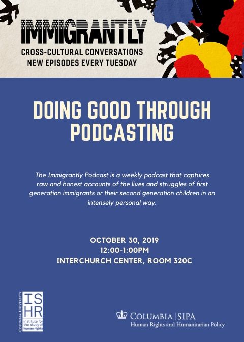 In the last few years, podcasting as a medium and an industry has grown at an unprecedented rate. As the types of podcasts that are being released continue to diversify, we're seeing more people take the initiative to use podcasting as a means to discuss issues that aren't being addressed elsewhere. When it comes to human rights issues, particularly those that have not been picked up by mainstream media sources, podcasting becomes an important tool for amplifying human rights issues to wide audiences. This is something that Saadia Khan, the host of the podcast Immigrantly, knows very well. Saadia did her Masters in Human Rights Studies from GSAS. She started Immigrantly in the fall of 2018 to showcase the idiosyncrasies of every immigrant story. Saadia's experiences in the world of human rights directly inform her podcasting, and she's excited to discuss these topics on October 30th!