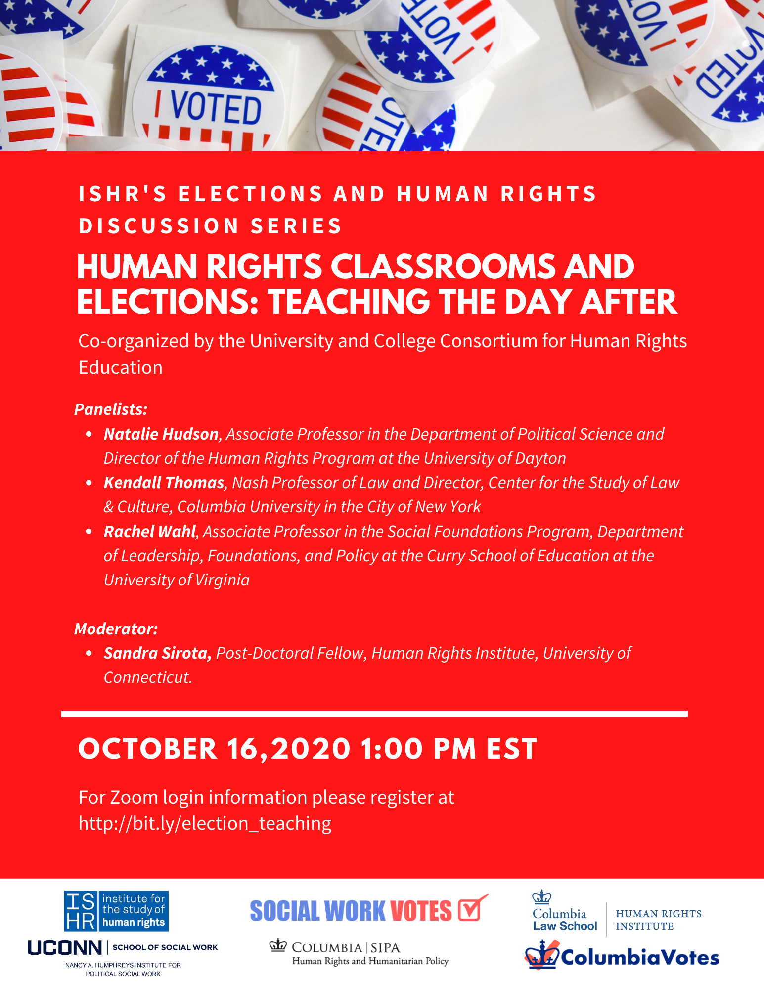 During this event, human rights educators will discuss how they plan to address anticipated challenges and opportunities with respect to teaching after the 2020 U.S. elections. They will also share techniques for ensuring an inclusive and respectful environment around teaching and discussing contentious issues.
