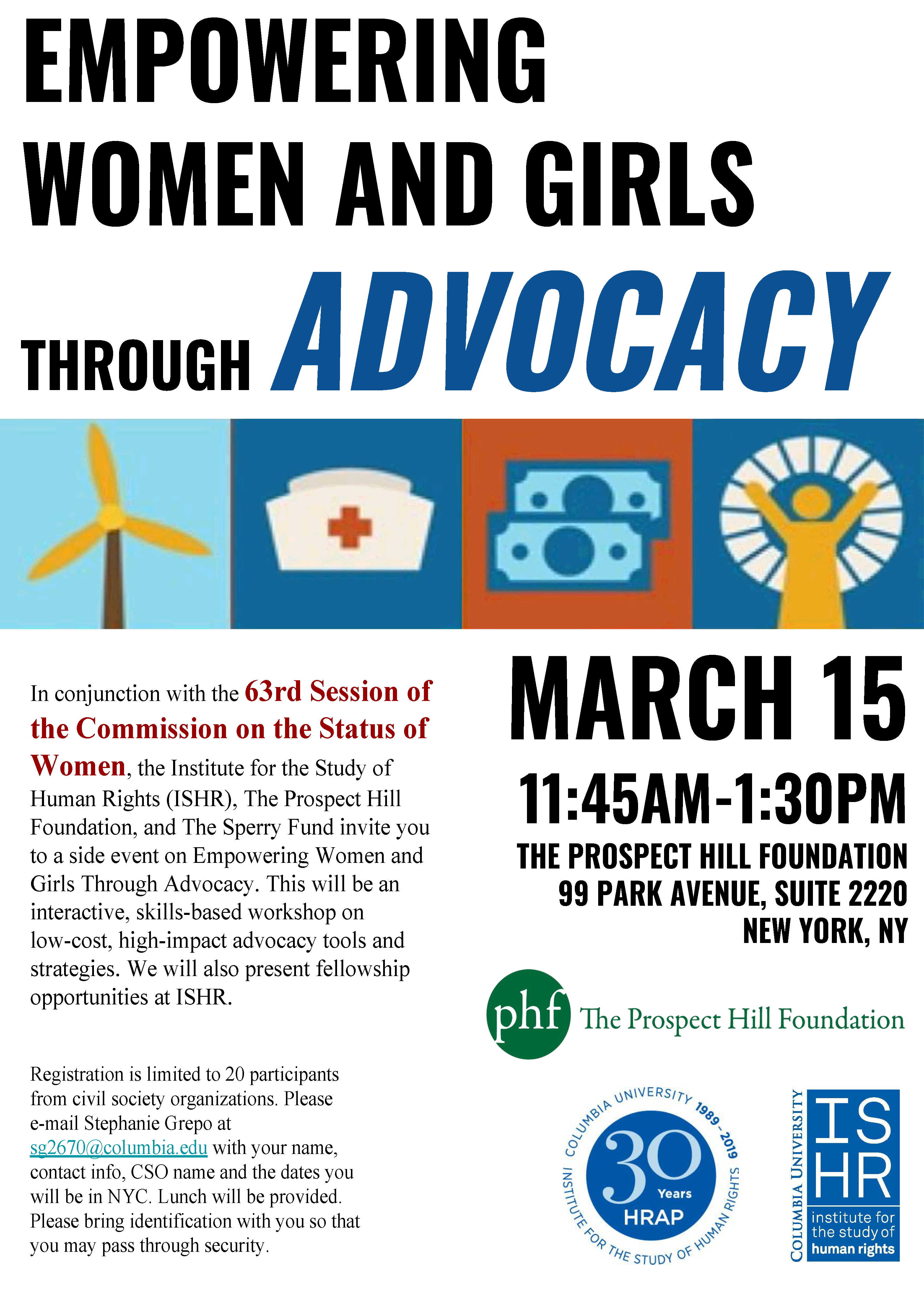 Friday, March 15, 2019 1145 AM - 1:30 PMThe Prospect Hill Foundation, 99 Park Ave, Ste 2220, New York, NYIn conjunction with the 63rd Session of the Commission on the Status of Women, the Institute for the Study of Human Rights (ISHR), The Prospect Hill Foundation, and The Sperry Fund invite you to a side event on Empowering Women and Girls Through Advocacy. This will be an interactive, skills-based workshop on low-cost, high-impact advocacy tools and strategies. We will also present fellowship opportunities at ISHR. Registration is limited to 20 participants from civil society organizations. Please email Stephanie Grepo at sg2670@columbia.edu with your name, contact info, CSO name and the dates you will be in NYC. Lunch will be provided. Please bring identification with you so that you may pass through security. Click below to see the event on the Columbia events calendar.