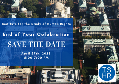 Thursday, April 27, 5-7 pm91 Claremont Avenue, 10TSave the date for ISHR's annual End of Year Celebration. Join us for a social to celebrate the accomplishments of the 2023 graduating class and spend time with human rights students, faculty, and staff. Student speakers and fun surprises to be announced. Click below to see the event on the Columbia events calendar and registerEvent link