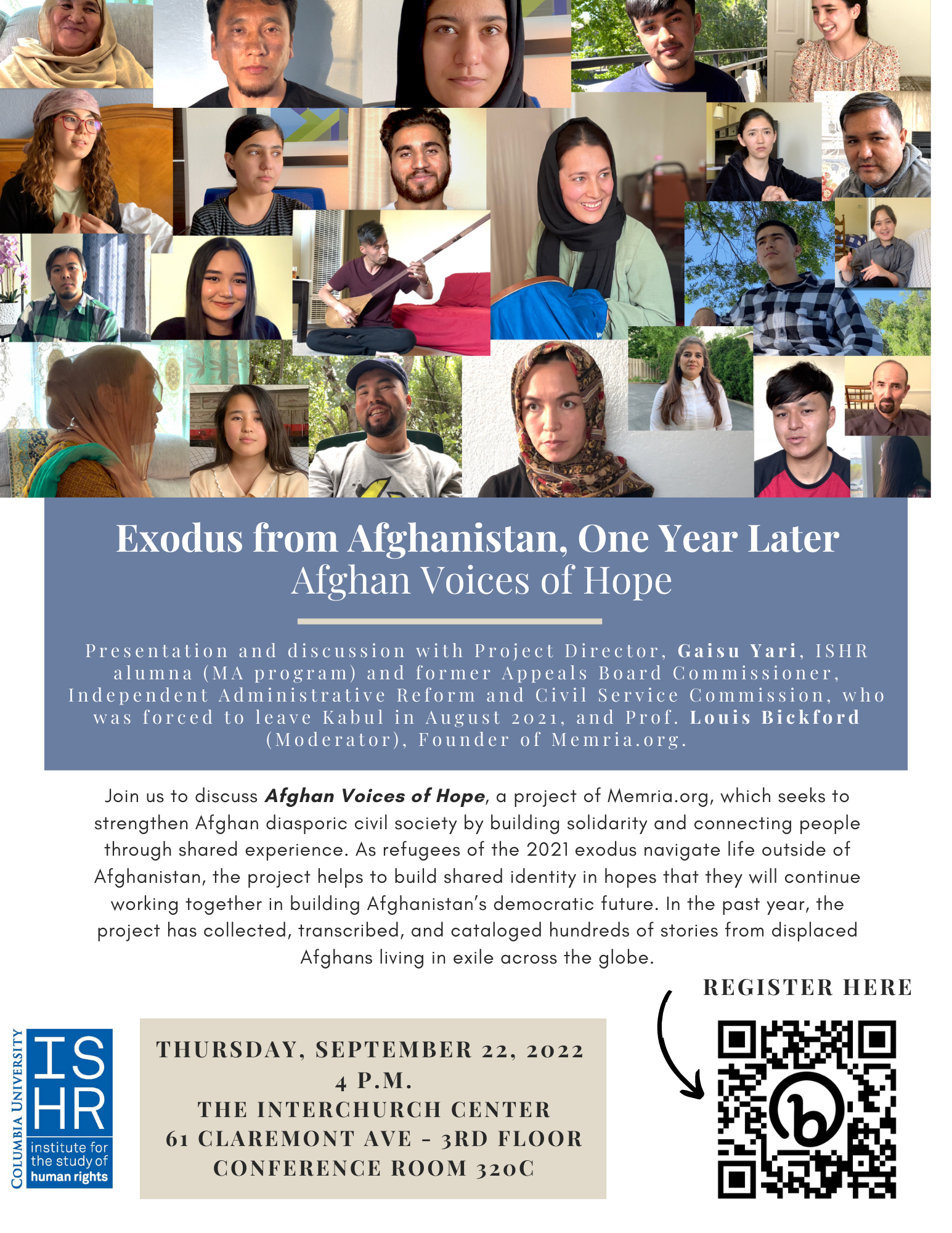Thursday, September 22, 2022 4:00 PM - 5:00 PMInterchurch Center, 475 Riverside Dr., New York, NY 10027 Room 320CPresentation and discussion with project director, Gaisu Yari, ISHR alumna (MA program) and former Appeals Board Commissioner, Independent Administrative Reform and Civil Service Commission, who was forced to leave Kabul in August 2021, and Prof Louis Bickford (moderator), founder of Memria.org. Join us to discuss Afghan Voices of Hope, a project of Memria.org, which seeks to strengthen Afghan diasporic civil society by building solidarity and connecting people through shared experience. As refugees of the 2021 exodus navigate life outside of Afghanistan, the project helps to build shared identity in hopes that they will continue working together in building Afghanistan's democratic future. In the past year, the project has collected, transcribed, and cataloged hundreds of stories from displaced Afghans living in exile across the globe. Register here: https://bit.ly/3x1TpLL Please note that this event has limited capacity and will be on a first-come, first-served basis, but you must register to have access to the building. Click below to registerEvent link