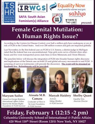 Friday, February 1, 2019 12:15 PM - 2:00 PMInternational Affairs Building, 420 W. 118 St., New York, NY 10027 Room 1201According to the Centers for Disease Control, over half a million girls have undergone or are at risk of female genital mutilation (FGM) in the United States. Join us for a screening of survivor testimonies, an enriching panel on the integration of FGM into broader human rights discourse, and a discussion as well as action items to follow. The event will also be live-streamed on Facebook (see the Eventbrite link below for more information). Please RSVP here! (https://www.eventbrite.com/e/fgm-a-human-rights-issue-tickets-55431581352) Panelists: Maryum Saifee: Council on Foreign Relations International Affairs Fellow based at the Human Rights Foundation and FGM Survivor Aissata M. B. Camara: Co-founder of There is No Limit Foundation and FGM Survivor Maryah Haidery: Activist, Sahiyo Member and FGM Survivor Shelby Quast: Americas Director, Equality Now Click below to see the event on the Columbia events calendar.Event link