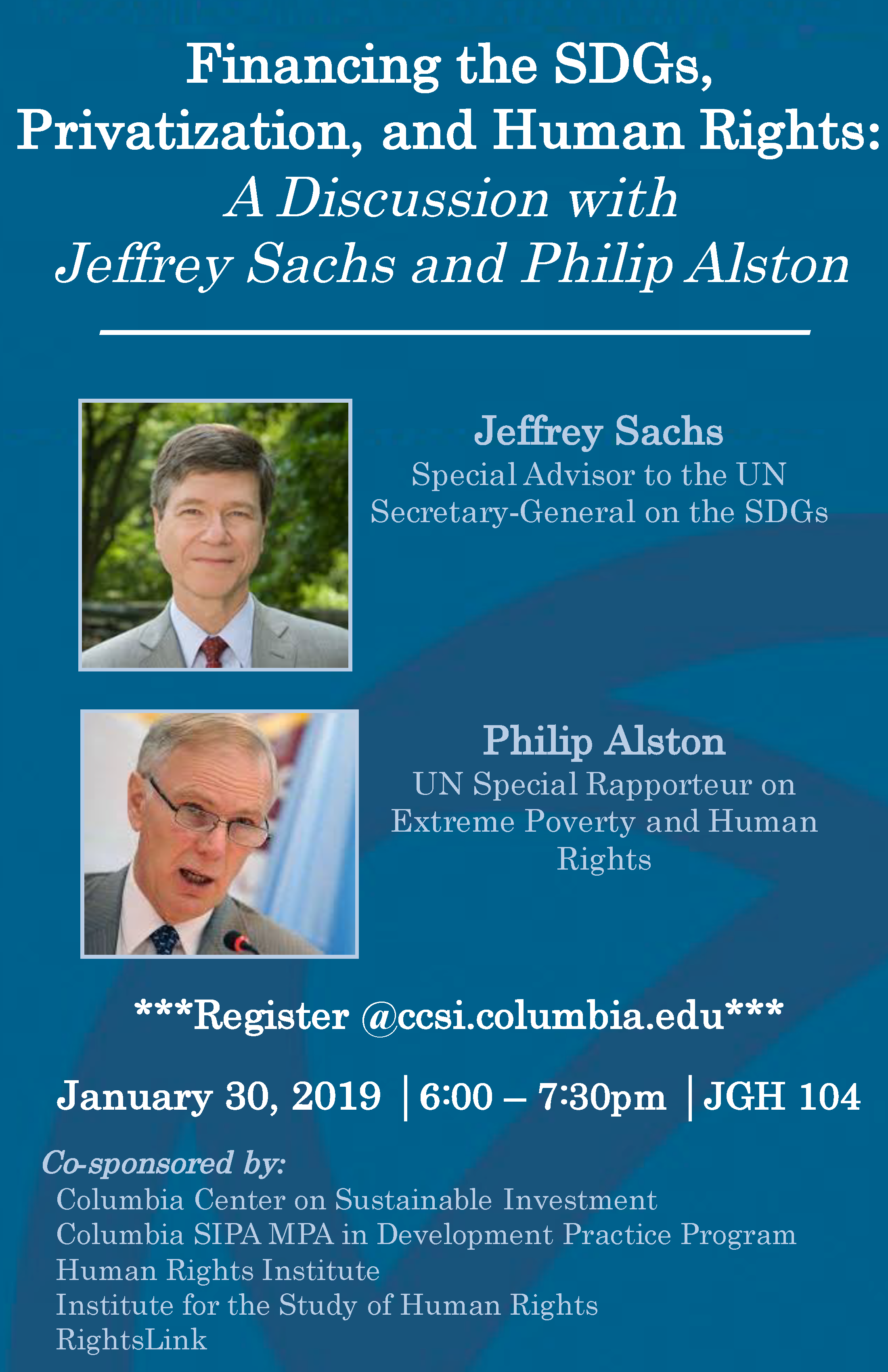 The UN’s Sustainable Development Goals (SDGs) seek to provide a roadmap for all governments to eliminate extreme poverty and achieve a range of other key economic and social goals by 2030. However, financing to achieve these objectives, including the eradication of extreme poverty, currently falls trillions of dollars short. Achievement of the SDGs is at risk unless current finance trajectories can be shifted. Jeffrey Sachs, the Special Advisor to the UN Secretary-General on the SDGs, and Philip Alston, the UN’s Special Rapporteur on extreme poverty and human rights, will discuss the relationship between finance, human rights, and the SDGs, including a focus on current trends toward privatization.