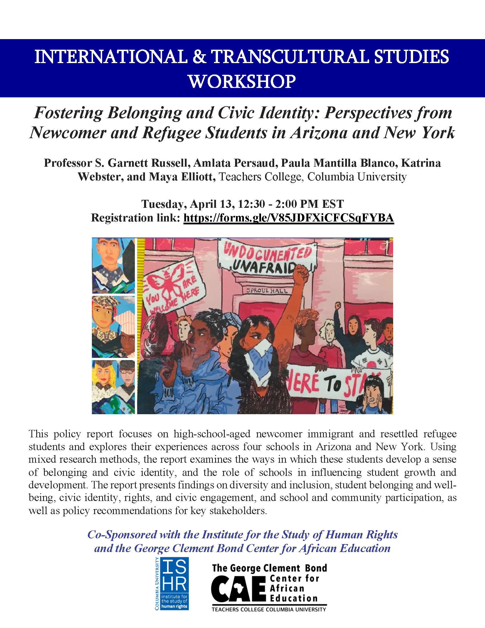 This policy report focuses on high-school-aged newcomer immigrant and resettled refugee students and explores their experiences across four schools in Arizona and New York. Using mixed research methods, the report examines the ways in which these students develop a sense of belonging and civic identity, and the role of schools in influencing student growth and development. The report presents findings on diversity and inclusion, student belonging and well-being, civic identity, rights, and civic engagement, and school and community participation, as well as policy recommendations for key stakeholders.