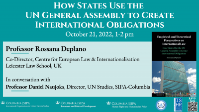 Fri, Oct 21, 2022 1 PM – 2 PM EDT IAB 403 420 W 118th St, New York 10027, United StatesResolutions adopted by the UN General Assembly are often framed in normative language. Yet, they acquire legal significance only to the extent that states find it desirable or convenient. In her talk on her new book, Empirical and Theoretical Perspectives on International Law: How States Use the UN General Assembly to Create International Obligations (Cambridge University Press 2022), Professor Rossana Deplano, who directs the Centre for European Law and Internationalisation at Leicester Law School, sheds light on the processes through which UN General Assembly resolutions acquire legal significance through state practice. She shows how states attribute legal significance to resolutions in three different contexts: at the time of adoption, within domestic law and in international practice. The insights are quintessential to understand the making and politics of public international law. In conversation with Daniel Naujoks, Director of SIPA's International Organization and UN Studies specialization. Columbia students, faculty and staff may attend in person; others please join us virtually. Please see the different registration options. A light lunch will be served after the event. You can read excerpts from the book here. Click below to RSVPEvent link