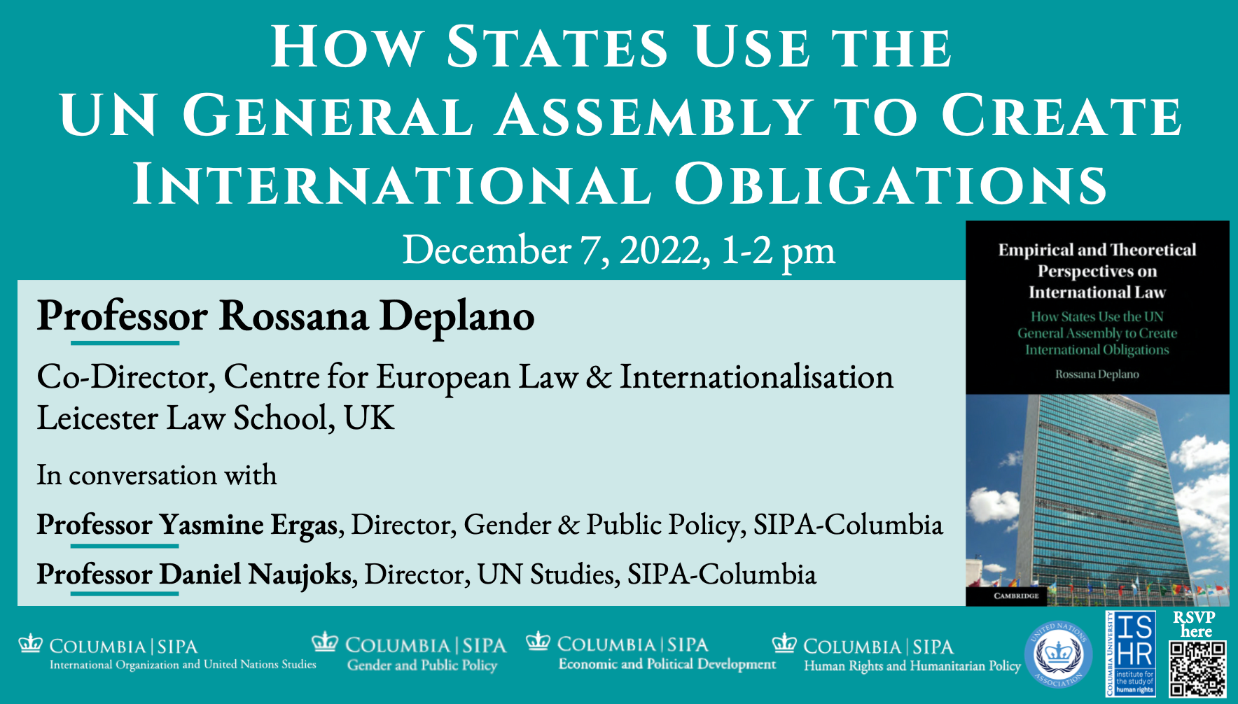 December 7, 2022, 1-2pm ETResolutions adopted by the UN General Assembly are often framed in normative language. Yet, they acquire legal significance only to the extent that states find it desirable or convenient. In her talk on her new book, Empirical and Theoretical Perspectives on International Law: How States Use the UN General Assembly to Create International Obligations (Cambridge University Press 2022), Professor Rossana Deplano, who directs the Centre for European Law and Internationalisation at Leicester Law School, sheds light on the processes through which UN General Assembly resolutions acquire legal significance through state practice. She shows how states attribute legal significance to resolutions in three different contexts: at the time of adoption, within domestic law and in international practice. The insights are quintessential to understand the making and politics of public international law. In conversation with Professor Yasmine Ergas, Director of SIPA's Gender and Public Policy specialization and Professor Daniel Naujoks, Director of SIPA's International Organization and UN Studies specialization. The speaker will attend virtually. Columbia students, faculty and staff may attend in person; others please join us virtually. Please see the different registration options. Click below to registerEvent link