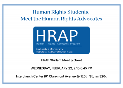FEBRUARY 22, 2:15-3:45 PMInterchurch Center (61 Claremont Avenue @ 120th St), rm 320cISHR is hosting an HRAP student meet & greet for majors, concentrators, and HRSMA students to get some dedicated time with the 2022-23 cohort of the Human Rights Advocates Program, a mainstay ISHR program since 1989. Join us for snacks and introductions to these ten advocates working on issues including LGBTQI+ rights, Indigenous Peoples’ rights, citizenship, migration, women's rights, and environmental justice. It is a wonderful opportunity to get to know the advocates early in their tenure at Columbia, so you can have ample time to strategize and collaborate. Read more about them, and REGISTER TODAY! Click below to registerEvent link