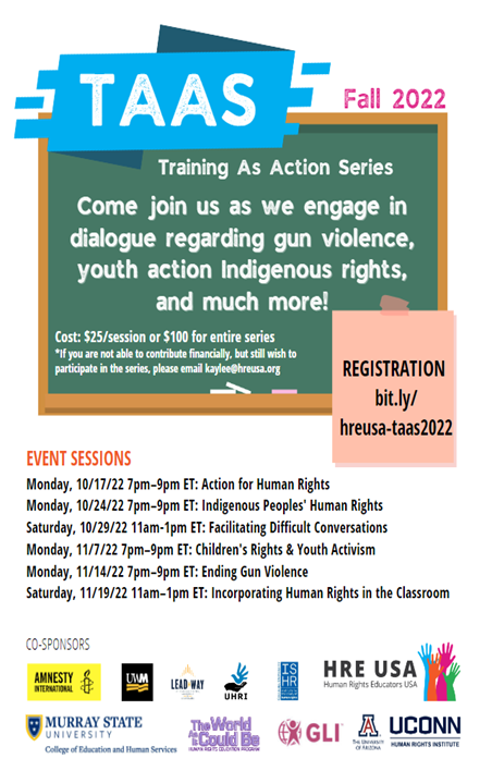 The Institute for the Study of Human Rights is co-sponsoring the Human Rights Educators USA’s annual Training as Action Series (TAAS). The TAAS is a virtual training series focused on bridging personal and collective action on some of the most critical human rights issues of today. Come join us as we engage in dialogue regarding gun violence, youth action, Indigenous rights, and much more!