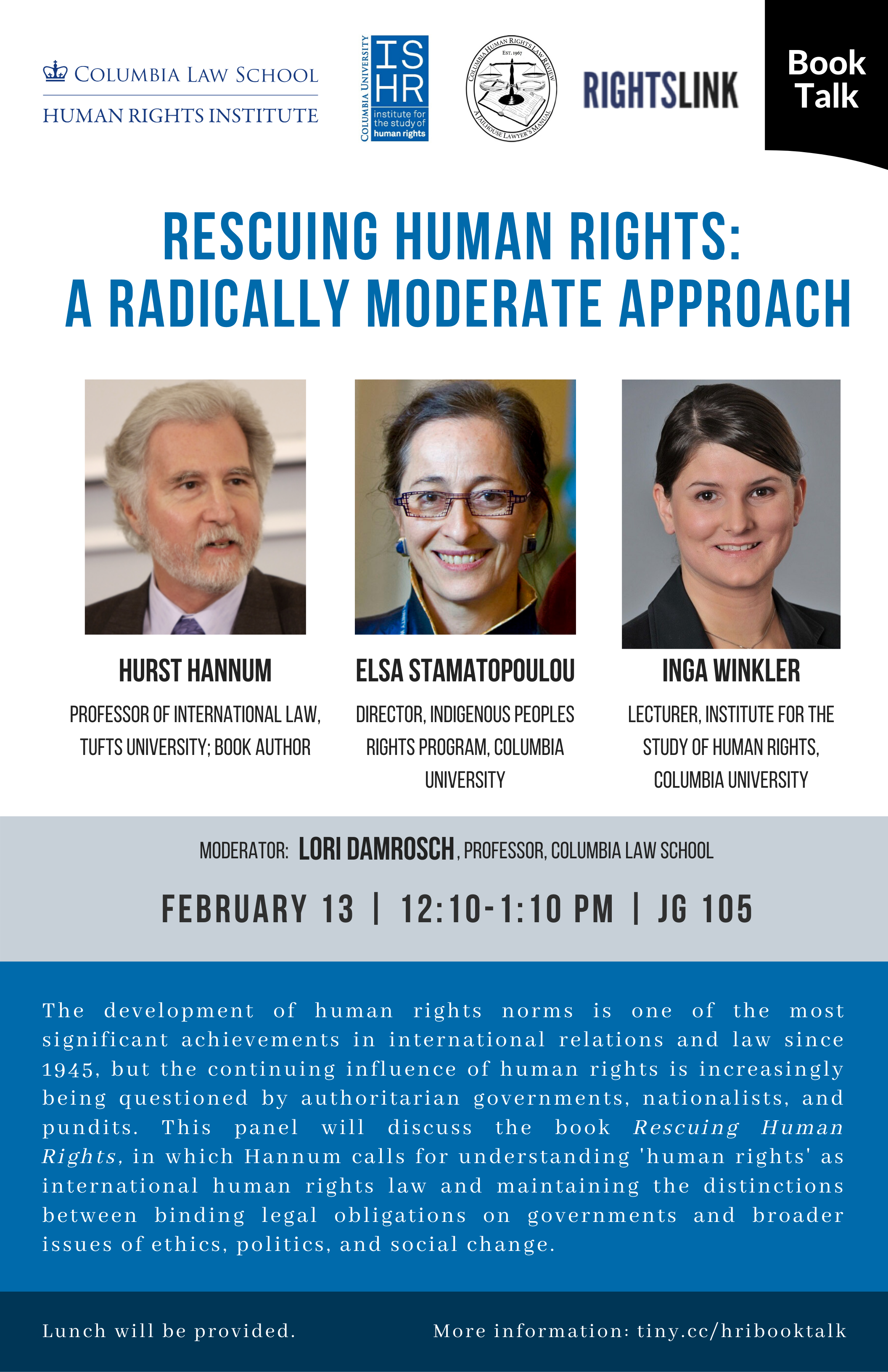 Join us for a conversation and debate about this idea and the potential and limits of international human rights law in securing human rights for all. The author will be joined in conversation by Elsa Stamatopoulou and Inga Winkler, two leaders in the international human rights field in the areas of cultural rights and the rights of indigenous peoples, the right to water, and education about human rights. The panel will be moderated by Lori Damrosch, Professor of International Law and Diplomacy, Columbia Law School.