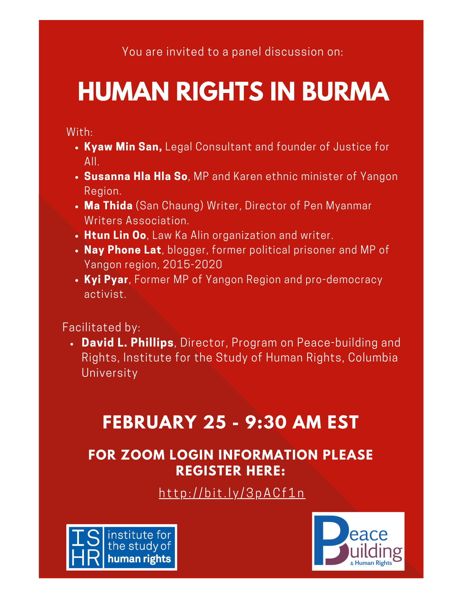 Thursday, February 25, 2021 9:30 AM - 10:30 AMOnline Speakers: -Kyaw Min San, Legal Consultant and founder of Justice for All. -Susanna Hla Hla So, MP and Karen ethnic minister of Yangon Region. -Ma Thida (San Chaung) Writer, Director of Pen Myanmar Writers Association. -Htun Lin Oo, Law Ka Alin organization and writer. -Nay Phone Lat, blogger, former political prisoner and MP of Yangon region, 2015-2020 -Kyi Pyar, Former MP of Yangon Region and pro-democracy activist. Facilitated by: -David L. Phillips, Director, Program on Peace-building and Rights, Institute for the Study of Human Rights, Columbia University For Zoom login information please register here: http://bit.ly/3pACf1n Click below to see the event on the Columbia events calendar.Event link