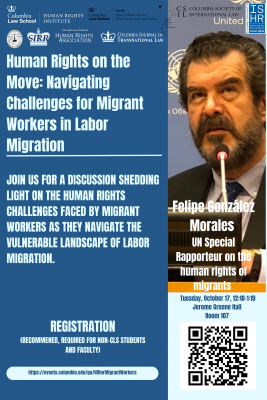 Join Columbia Law School's Human Rights Institute for a discussion shedding light on the human rights challenges faced by migrant workers as they navigate the precious and vulnerable landscape of labor migration, offering insights and strategies to safeguard their fundamental rights and dignity.