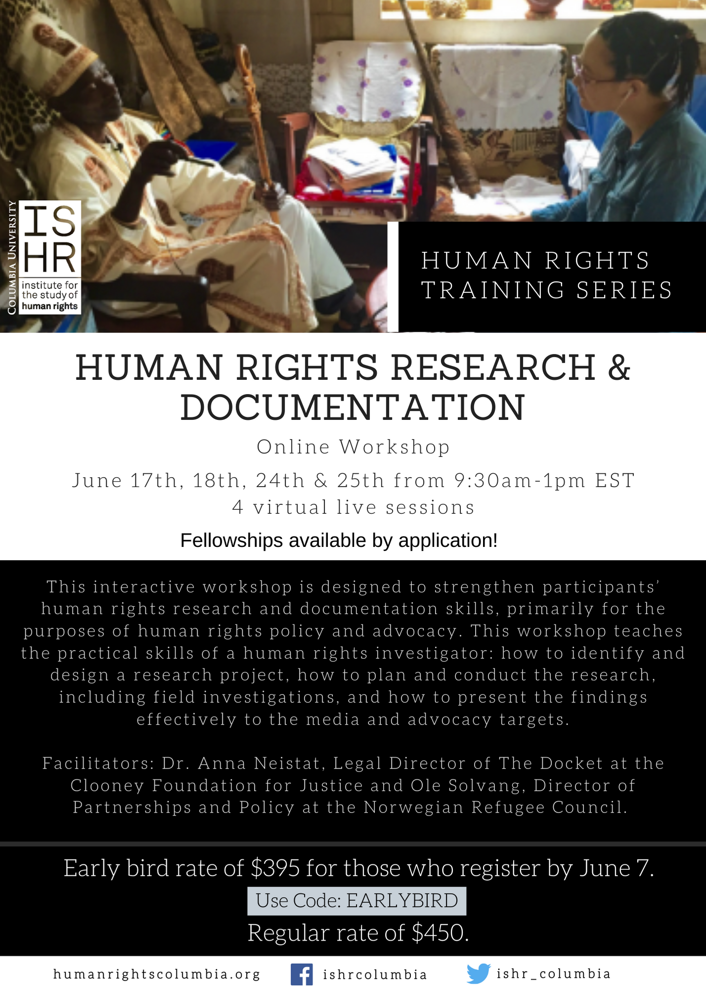 Columbia students are eligible for a 40% discount on the regular rate if enrolled by the early bird deadline (please email humanrightsed@columbia.edu for more information). We will also offer a limited number of reduced rates for those with significant financial need.