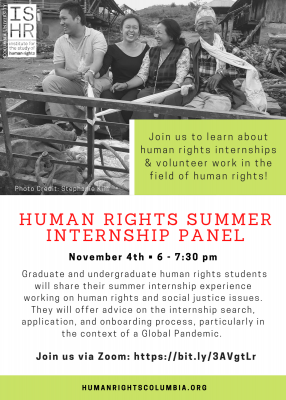 Graduate and undergraduate human rights students will share their summer internship experience working on human rights and social justice issues. They will offer advice on the internship search, application, and onboarding process, particularly in the context of a Global Pandemic.