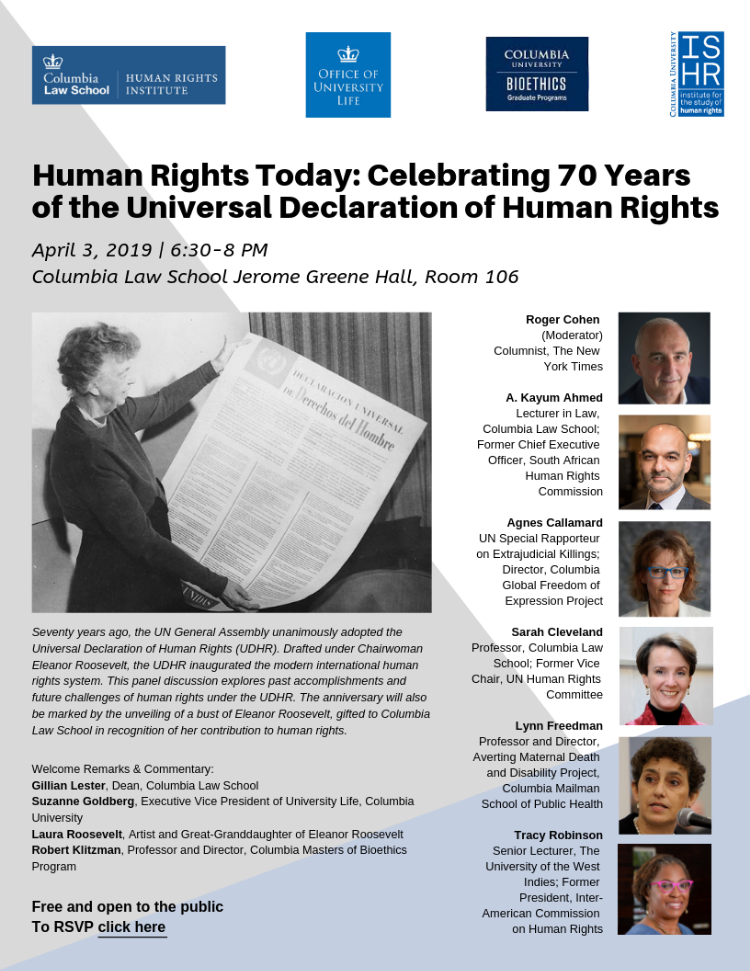 Seventy years ago, the UN General Assembly unanimously adopted the Universal Declaration of Human Rights (UDHR). Drafted under Chairwoman Eleanor Roosevelt, the UDHR inaugurated the modern international human rights system. This panel discussion explores past accomplishments and future challenges of human rights under the UDHR. The anniversary will also be marked by the unveiling of a bust of Eleanor Roosevelt, gifted to Columbia Law School in recognition of her contribution to human rights.