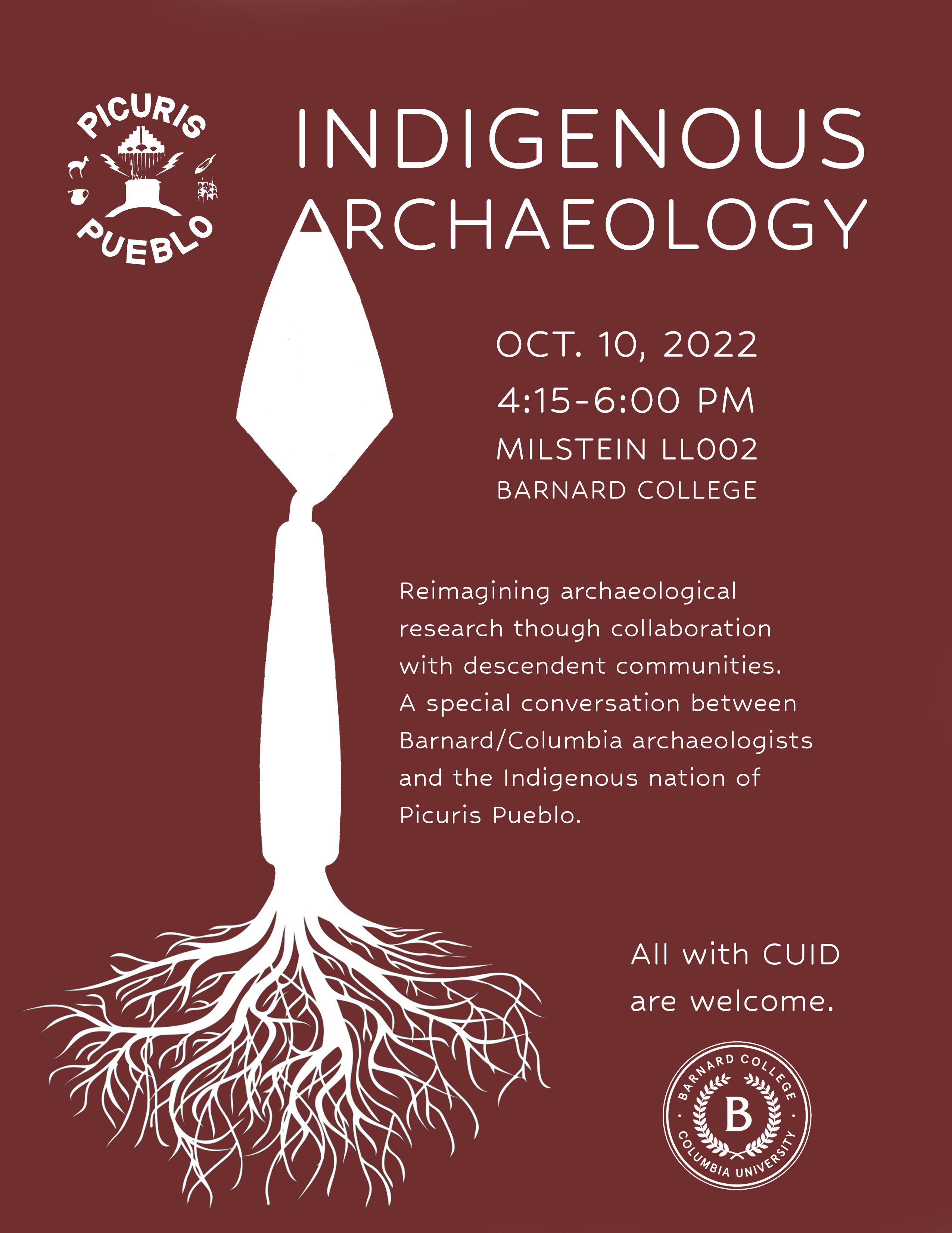 Monday, October 10, 2022 4:15pm - 6:00pmMilstein LL002, Barnard CollegeReimagining archaeological research through collaboration with descendent communities. A special conversation between Barnard/Columbia archaeologists and the Indigenous nation of Picuris Pueblo. All with CUID are welcome. -