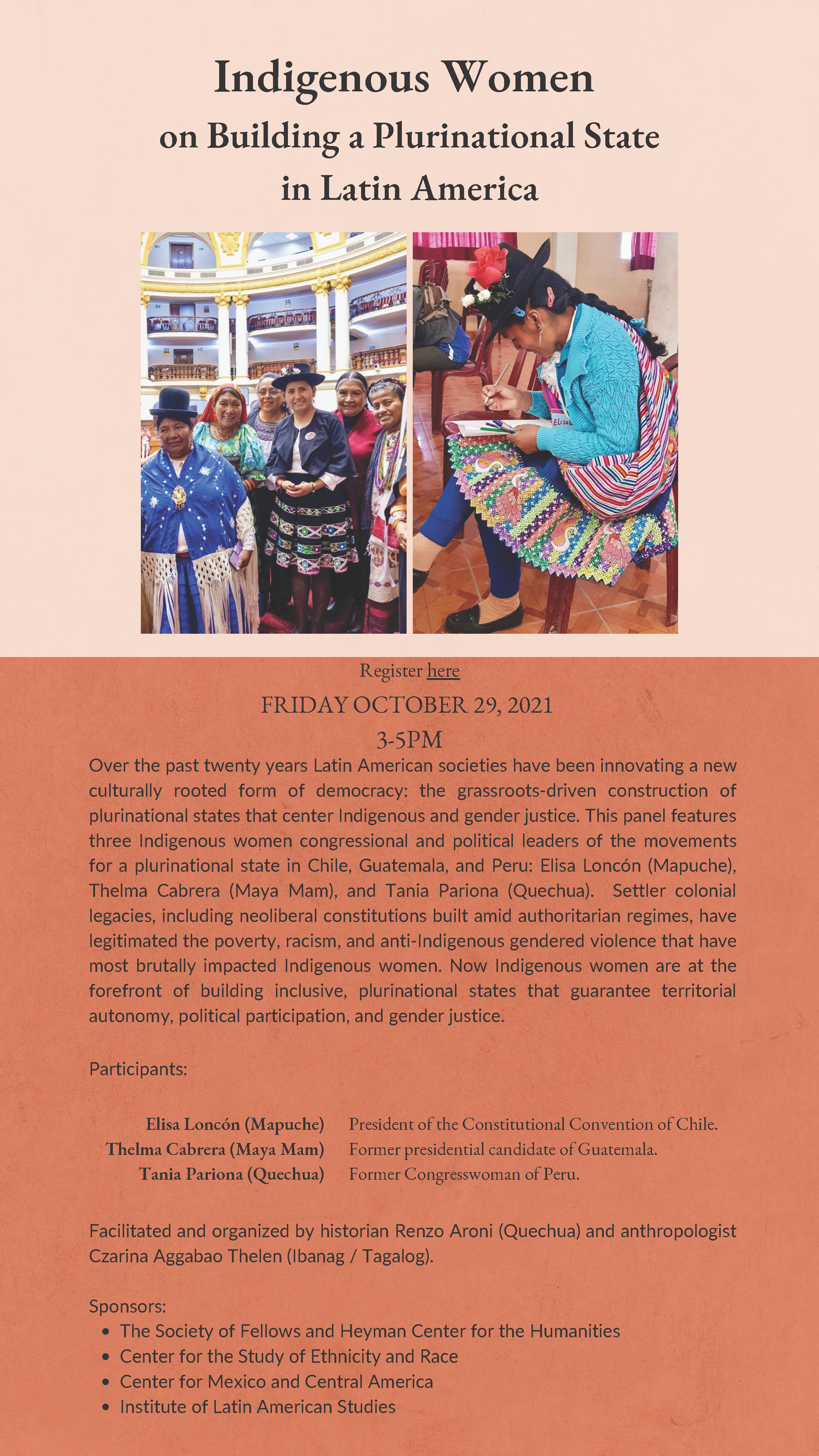 Over the past twenty years Latin American societies have been innovating a new culturally rooted form of democracy: the grassroots-driven construction of plurinational states that center Indigenous and gender justice. This panel features three Indigenous women congressional and political leaders of the movements for a plurinational state in Chile, Guatemala, and Peru: Elisa Loncón (Mapuche), Thelma Cabrera (Maya Mam), and Tania Pariona (Quechua). Settler colonial legacies, including neoliberal constitutions built amid authoritarian regimes, have legitimated the poverty, racism, and anti-Indigenous gendered violence that have most brutally impacted Indigenous women. Now Indigenous women are at the forefront of building inclusive, plurinational states that guarantee territorial autonomy, political participation, and gender justice.