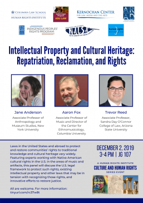 This event is co-sponsored by Columbia Law School's Human Rights Institute; the Indian Legal Program at Arizona State University's Sandra Day O'Connor College of Law; Columbia Law School's Kernochan Center for Law, Media, and the Arts; the Program in Arts Administration at the Teachers College, Columbia University; the Institute for the Study of Human Rights' Indigenous Peoples' Rights Program, Columbia University; Columbia Law School's Native American Law Student Association; and the Human Rights Working Group at Columbia University's School of International and Public Affairs.