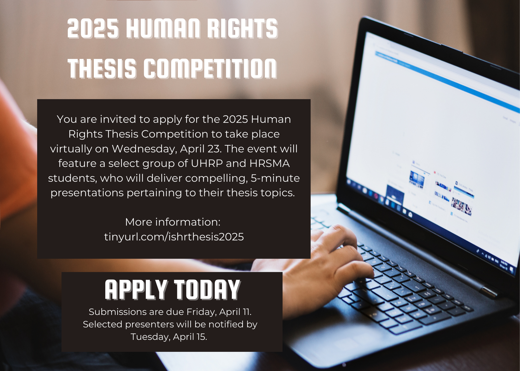 Wednesday, April 23, 2025 12:00 PM - 1:30 PMOnlineThe 2025 Human Rights Thesis Competition will take place on Zoom on Wednesday, April 23. Winners selected by faculty will receive a cash prize of $500 each and the audience winner will receive $300. To compete, submit a short video describing the topic you would cover if selected to present and what strategies you would use to deliver an engaging presentation. Submit by April 11: APPLY HERE. Event is April 23; register below. Click below to registerEvent link