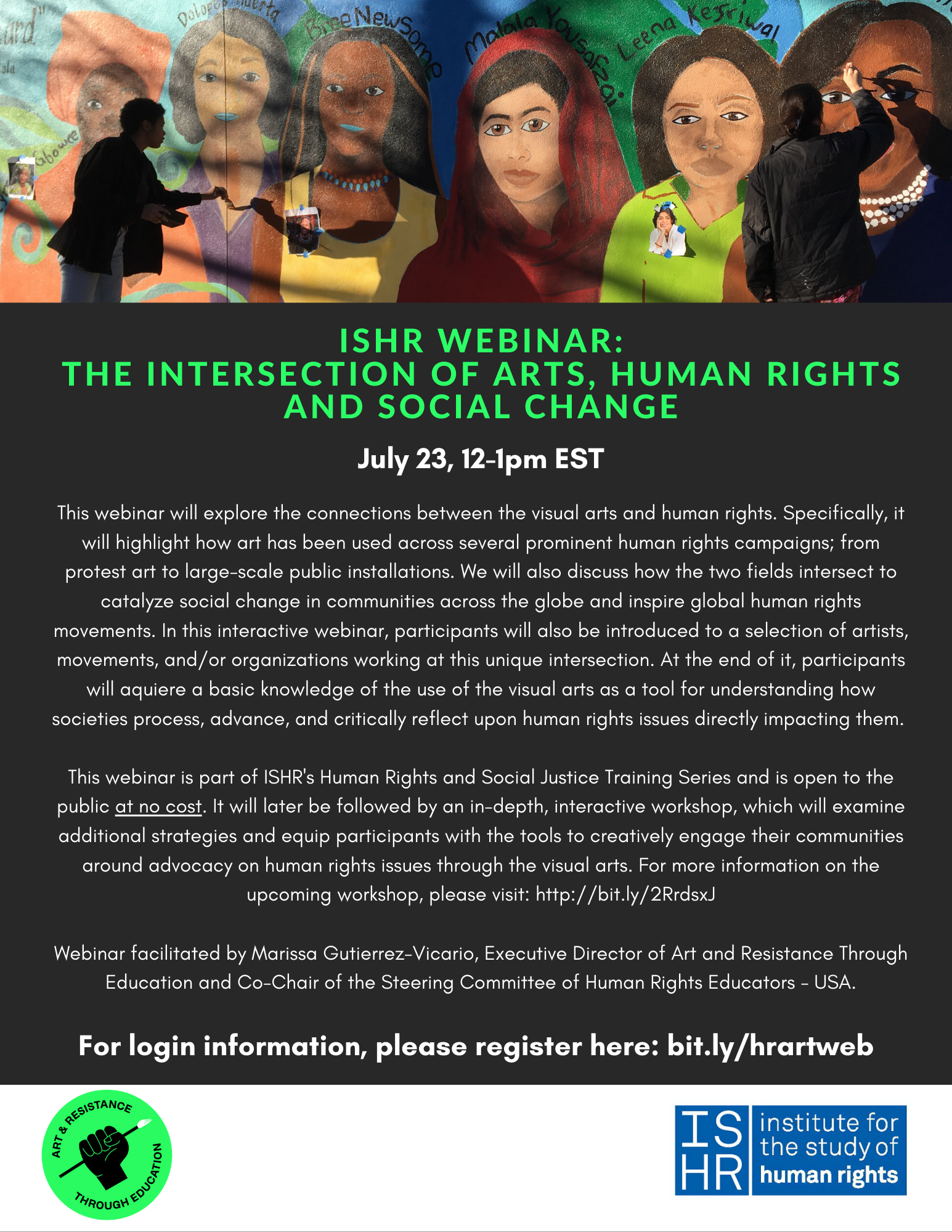 This webinar is part of ISHR's Human Rights and Social Justice Training Series and is open to the public at no cost. It will later be followed by an in-depth, interactive workshop, which will examine additional strategies and equip participants with the tools to creatively engage their communities around advocacy on human rights issues through the visual arts. For more information on the upcoming workshop, please visit: http://bit.ly/2RrdsxJ