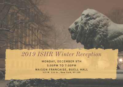 Monday, December 9, 2019 5:00 PM - 7:00 PMBuell Hall, 515 W. 116 St., New York, NY 10027 Maison FrancaiseCelebrate the season with the Institute for the Study of Human Rights and bid farewell to the Human Rights Advocates and the Alliance for Historical Dialogue and Accountability Fellows! Food and drink will be served. Click below to see the event on the Columbia events calendar.Event link