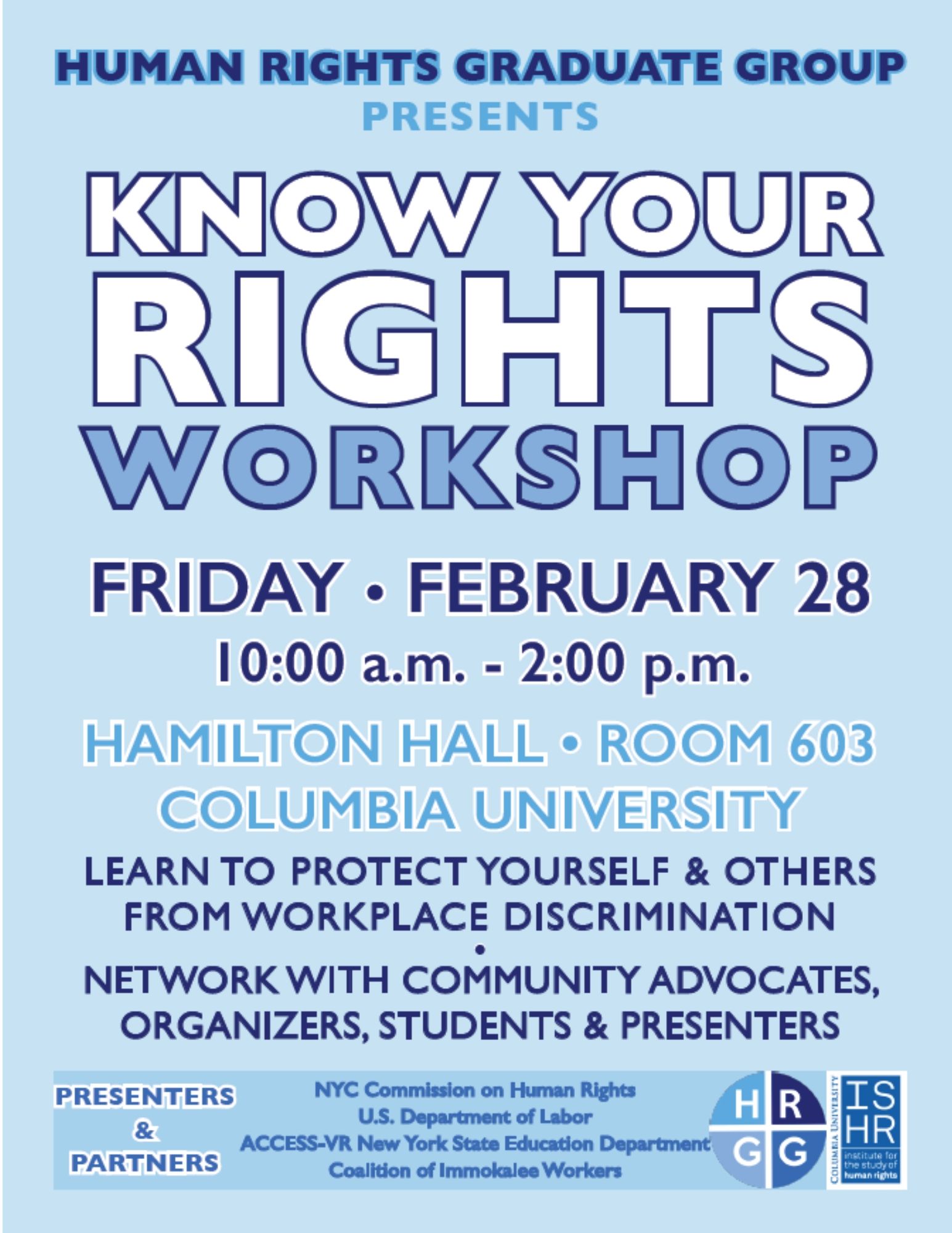 Friday, February 28, 2020 10:00 AM - 2:00 PMHamilton Hall, 1130 Amsterdam Ave., New York, NY 10027 603HUMAN RIGHTS GRADUATE GROUP PRESENTS: Know your Rights Workshop -Learn to protect yourself and others from workplace discrimination. -Network with community advocates, organizers students and presenters. PRESENTERS AND PARTNERS: NYC Commission on Human Rights U.S. Department of Labor ACCESS-VR New York State Education Department Coalition of Immokalee Workers Click below to see the event on the Columbia events calendar.Event link