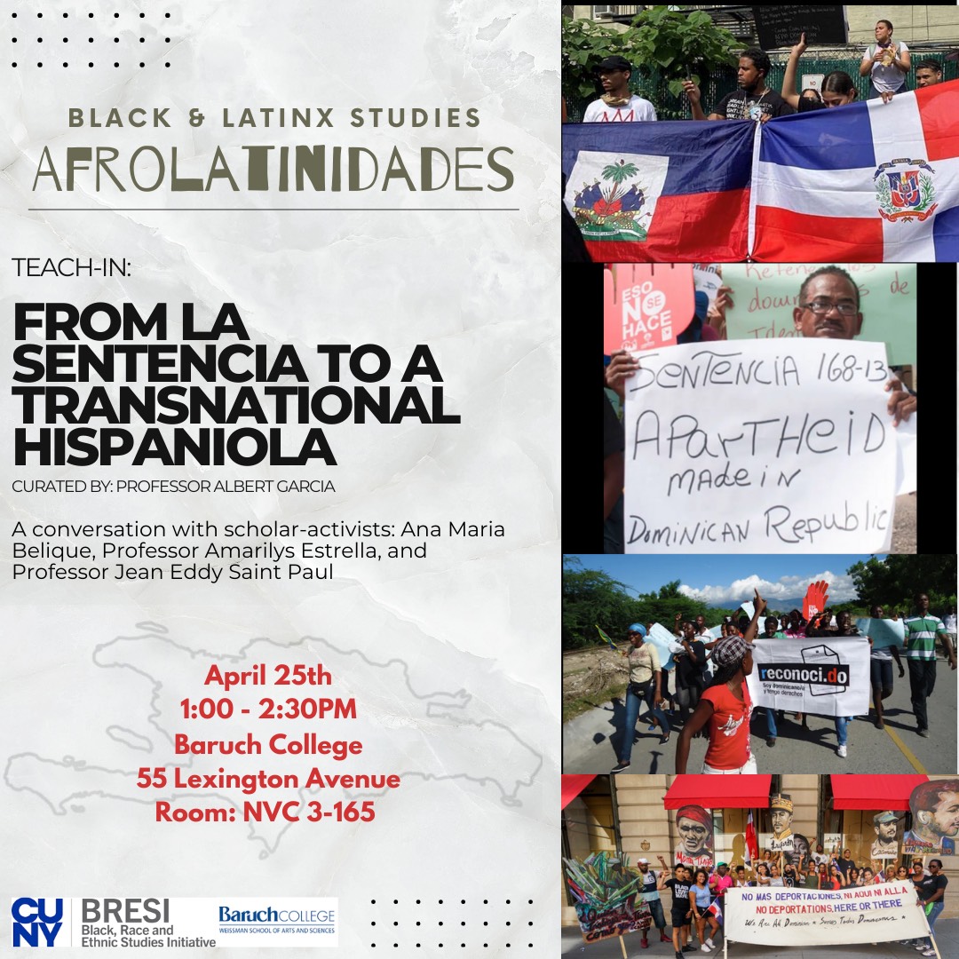 Tuesday, April 25, 1-2:30 pmBaruch College, 55 Lexington Avenue, Room NVC 3-165Baruch College's Black and Latinx studies Afrolatinidades present: Teach-in: From La Sentencia to a Transnational Hispaniola Curated by Professor Albert Garcia A conversation with scholar-activists: Ana Maria Belique Professor Amarilys Estrella Professor Jean Eddy Saint Paul Link to event pageEvent link