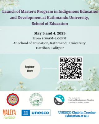 May 3 and 4, 8:30 am to 2 pm ( Nepal time) OnlineLaunch of Master Program in Indigenous Education and Development at Kathmandu University, School of Education from 3 to 4th May 2023. Click below join the event onlineEvent link