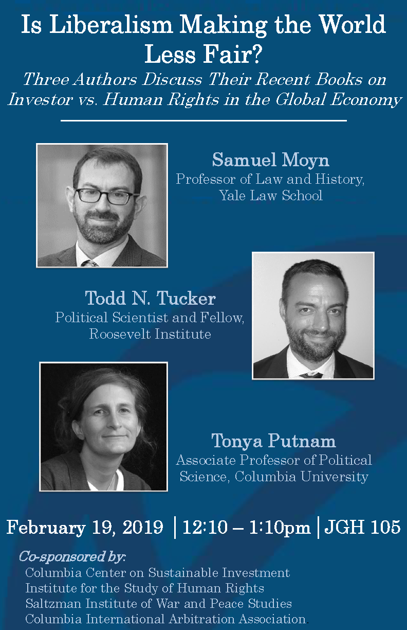 Liberal legal systems can make economic life predictable, but have a spottier track record protecting the interests of those who lack economic power. Heading into the 2020 political cycle, what role do (or could) US institutions play in aggravating or lessening economic liberalism’s downsides? Join CCSI, the Institute for the Study of Human Rights, the Saltzman Institute of War and Peace Studies, and the Columbia International Arbitration Association for a discussion with three authors on their recent books on this tension.