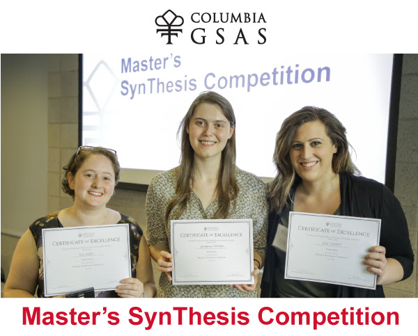 Thursday, May 9, 2019 4:00 to 7:00pmJed D. Satow Room, 5th floor of Lerner HallJoin the Graduate School of Arts and Sciences for the fourth annual GSAS Master’s SynThesis Competition, a celebration of MA students’ culminating work.At the event, twelve GSAS master’s students will share their research in no more than five minutes. First-, second-, and third-place prizes will be awarded by a judging panel of interdisciplinary faculty. A reception for GSAS master’s students, faculty, staff, and alumni will follow the presentations.Please RSVP here. -