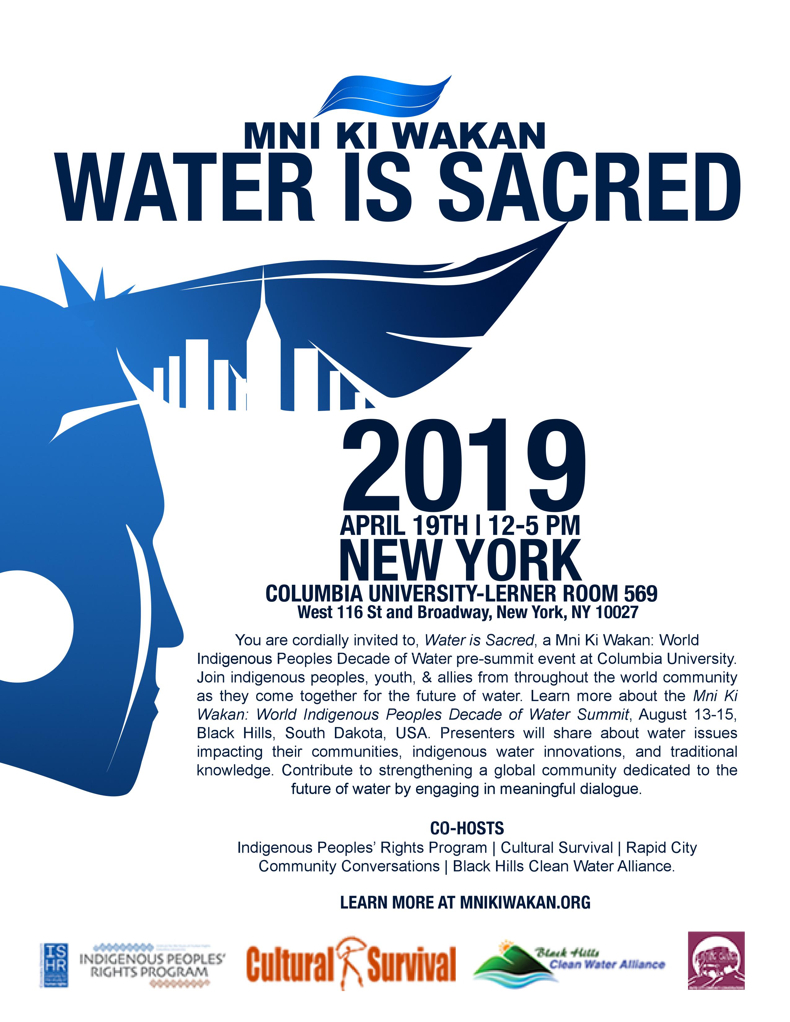 Friday, April 19, 2019 12:00 PM - 5:00 PMLerner Hall, 2920 Broadway, New York, NY 10027 569You are cordially invited to, Water is Sacred, a Mni Ki Wakan: World Indigenous Peoples Decade of Water pre-summit event at Columbia University. Join indigenous peoples, youth, & allies from throughout the world community as they come together for the future of water. Learn more about the Mni Ki Wakan: World Indigenous Peoples Decade of Water Summit, August 13-15, Black Hills, South Dakota, USA. Presenters will share about water issues impacting their communities, indigenous water innovations, and traditional knowledge. Contribute to strengthening a global community dedicated to the future of water by engaging in a meaningful dialogue. Click below to see the event on the Columbia events calendar.Event link
