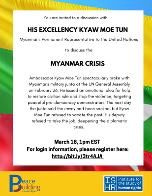 Thursday, March 18, 2021 1:00 PM - 2:00 PMOnline Please join us for a discussion His Excellency Kyaw Moe Tun, Myanmar's Permanent Representative to the United Nations, to discuss the Myanmar Crisis on March 18th at 1pm EST. Ambassador Kyaw Moe Tun spectacularly broke with Myanmar's military junta at the UN General Assembly on February 26. He issued an emotional plea for help to restore civilian rule and stop the violence, targeting peaceful pro-democracy demonstrators. The next day the junta said the envoy had been sacked, but Kyaw Moe Tun refused to vacate the post. His deputy refused to take the job, deepening the diplomatic crisis. For login information, please register here: http://bit.ly/3tr4AJA Click below to see the event on the Columbia events calendar.Event link